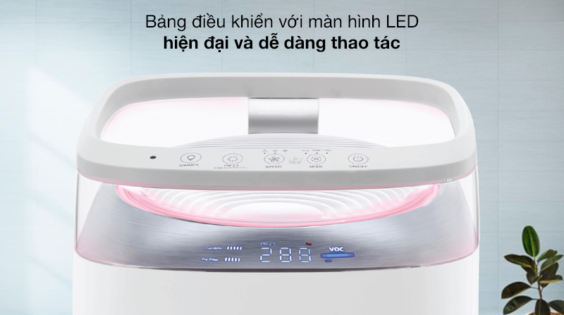 Bảng điều khiển với màn hình LED hiện đại, giúp bạn dễ dàng thao tác sử dụng với sự lựa chọn 3 chế độ lọc: Auto - Tự động (cảm biến bụi, cảm biến ánh sáng), Sleep (dùng khi ngủ ban đêm), Turbo (lọc nhanh) hoặc điều chỉnh 3 cấp độ gió: Thấp - Trung bình - Cao.
