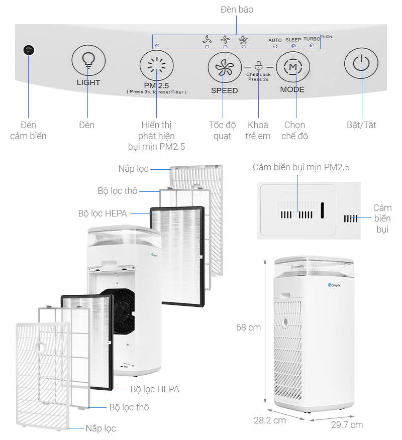 Máy lọc không khí Casper sử dụng hệ thống màng lọc 3 lớp với thiết kế bộ lọc ở 2 bên giúp tăng gấp đôi tốc độ lọc khí, mang đến cho bạn một môi trường sống trong lành, sạch sẽ, giảm thiểu các bệnh liên quan đến đường hô hấp, dị ứng da. Hệ thống màng lọc bao gồm: