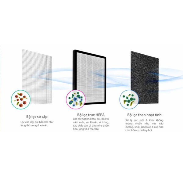 Hệ thống 3 màng lọc: Màng lọc sơ bộ, màng lọc TRUE HEPA và màng lọc than hoạt tính. Loại bỏ 99,97% bụi, phấn hoa, khói, mùi, bào tử nấm mốc và vẩy da thú cưng; lọc các hạt nhỏ 0,3 micron và bụi mịn PM 2.5. Hỗ trợ không khí tốt nhất cho người hen suyễn và trẻ nhỏ.