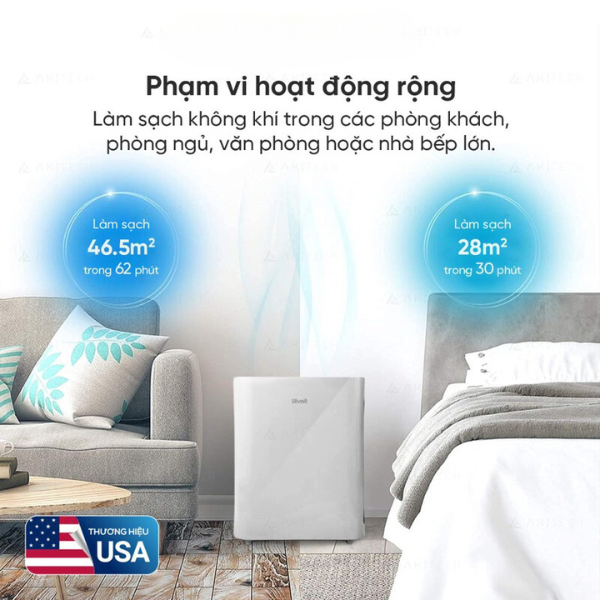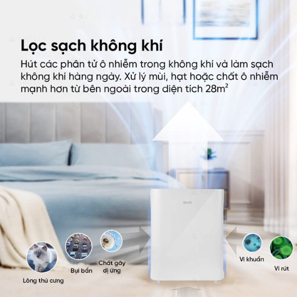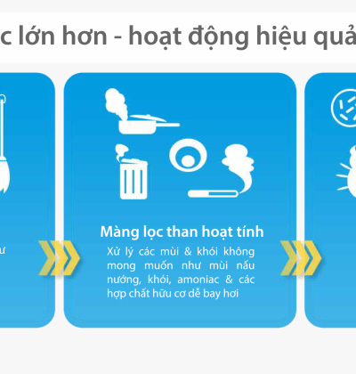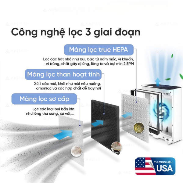 Bộ lọc trước, bộ lọc True Hepa & Bộ lọc than hoạt tính hiệu quả cao phối hợp với nhau để loại bỏ vi khuẩn trong không khí, mạt bụi, bào tử nấm mốc, chất gây dị ứng, mùi, vẩy da thú cưng, khói & VOC (hợp chất hữu cơ dễ bay hơi). Bộ lọc True Hepa cũng bẫy 99,97% các hạt lớn hơn 0.3 micron.