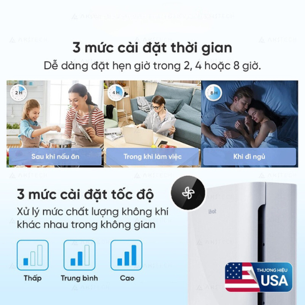 Chọn tốc độ quạt thấp, trung bình hoặc cao để xử lý mức chất lượng không khí khác nhau trong không gian lên tới mức phù hợp trong phòng kích thước bình thường hoặc không gian văn phòng. Dễ dàng đặt hẹn giờ trong 2, 4 hoặc 8 giờ.