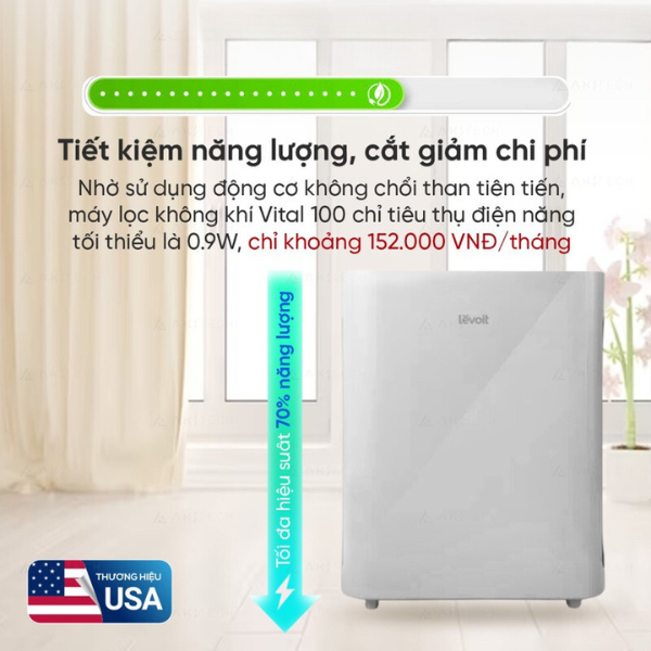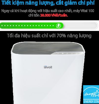 Nhờ sử dụng động cơ không chổi than tiên tiến, máy lọc không khí Vital 100 chỉ tiêu thụ điện năng tối thiểu là 0.9W. Nếu sử dụng máy này xuyên suốt 24 giờ/ ngày, trong cả năm thì chỉ tốn khoảng 152.000Đ/ tháng tiền điện, ít hơn tới 30% so với các máy lọc không khí khác.