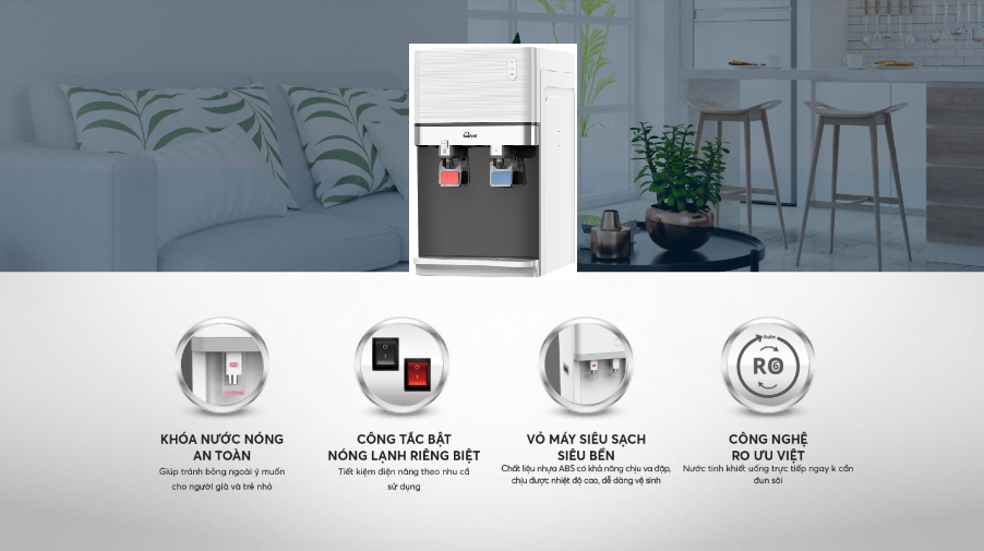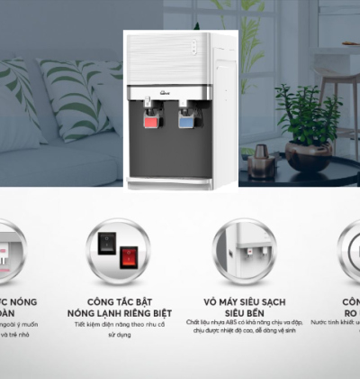 Máy làm lạnh bằng Block cho nước lạnh xuống 5-10 độ C chỉ trong vài phút hoạt động. Bầu đun bằng thép không gỉ an toàn, bền tốt. Với công năng chính là làm nóng và làm mát nước để người dùng sử dụng uống trực tiếp hoặc pha trà, cà phê, pha mì bất kì lúc nào… máy có bình chứa nước làm từ chất liệu inox chống gỉ, chống đóng cặn, đảm bảo chất lượng nước an toàn đối với sức khỏe người dùng. Vỏ bình được làm bằng nhựa an toàn cho sức khỏe, chắc chắn, dễ dàng lau chùi, vệ sinh. Ngay bên dưới là ngăn chứa bảo quản, chứa đồ, thuận tiện để chứa và lấy cốc chén, trà, cafe, thực phẩm