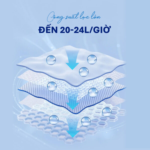 Công suất lọc mạnh mẽ 100GDP với khả năng lọc ~24 lít/ giờ: Đáp ứng nhu cầu sử dụng nước liên tục.