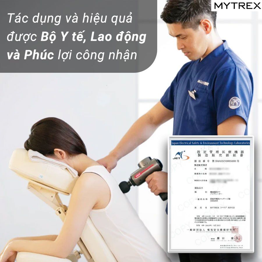 - MYTREX REBIVE đã nhận được chứng nhận thiết bị y tế. Với kích thước nhỏ gọn và độ rung mạnh mẽ dễ dàng sử dụng tại nhà. Đây là loại thiết bị massage mới có tác dụng kích thích sâu vào các cơ mà bạn quan tâm, làm giảm cứng khớp và đau nhức. Tôi đang bị cứng vai và đau lưng dưới. Tôi quá bận để đến tiệm massage. Ngay cả đối với những người như vậy, vẫn có thể giải quyết được gốc rễ của sự cứng khớp và đ a u đ ớ n trong thời gian ngắn.