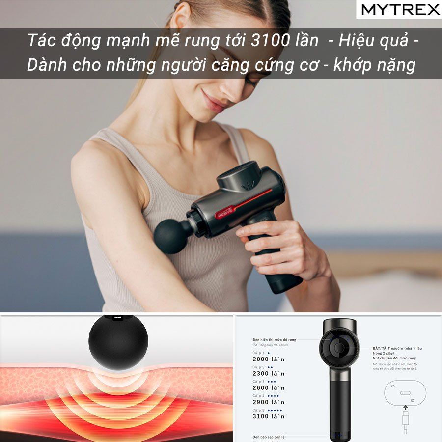 - MYTREX REBIVE tái tạo liệu pháp gõ (phương pháp đập) áp dụng rung động theo chiều dọc tốc độ cao. Rung tốc độ cao này có thể nới lỏng chính xác các điểm kích hoạt là nguồn gốc của cứng và đ a u. Cơ bắp và màng cân cơ trở nên linh hoạt. Nó thúc đẩy lưu thông máu và cải thiện độ cứng. Nó cũng làm giảm đ a u.