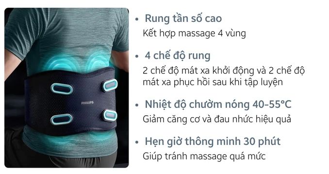 Tích hợp 4 vùng mát xa rung tần số cao, tác động trực tiếp vào vùng cơ bị đau nhức. Bạn có thể thư giãn cơ thắt lưng, đồng thời giảm mệt mỏi và đau nhức cơ bắp.