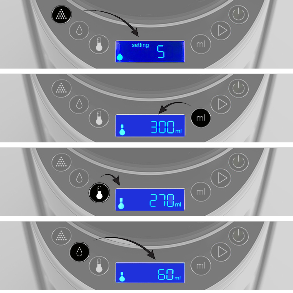 Máy cho phép tùy chỉnh nhiệt độ nước (ấm, ấm vừa và nhiệt độ phòng) và lượng sữa (từ 2 đến 10 ounces), phù hợp với nhu cầu và độ tuổi của bé.
