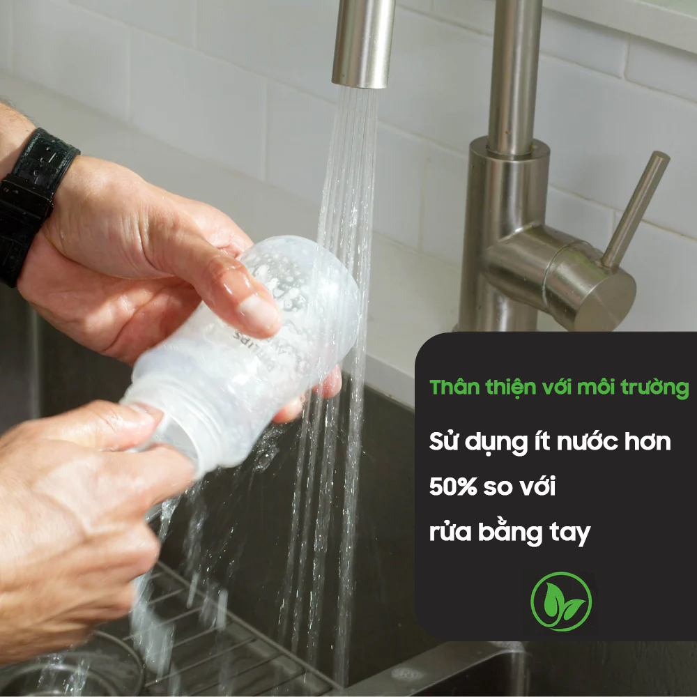 Sản phẩm tiết kiệm đến 50% lượng nước so với việc rửa bình bằng tay. Bố mẹ chỉ cần bỏ trực tiếp bình sữa, núm ti vào máy, nhấn nút và máy sẽ tự động làm sạch hoàn toàn.