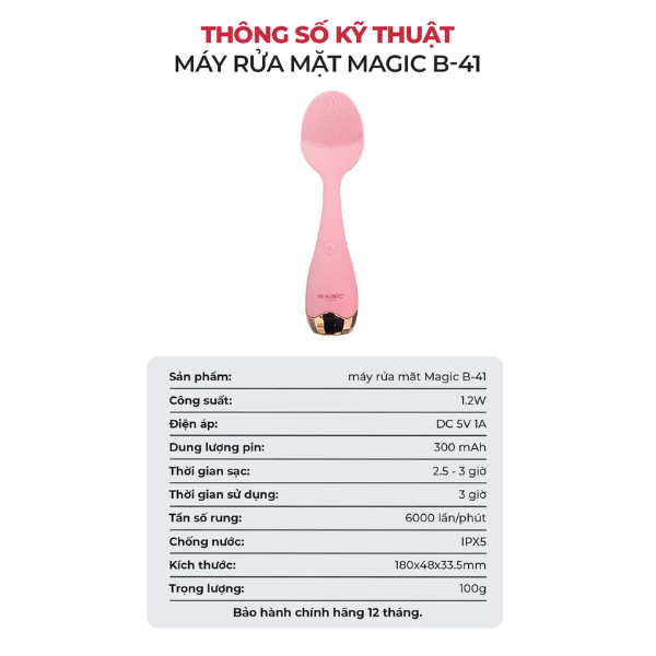 Máy rửa mặt Magic B-41 1.2W IPX5 là thiết bị chăm sóc da mặt hiện đại, giúp làm sạch sâu và massage da hiệu quả. Máy loại bỏ bụi bẩn, bã nhờn và lớp trang điểm còn sót lại, mang đến làn da sạch mịn, thông thoáng lỗ chân lông và cảm giác thư giãn.