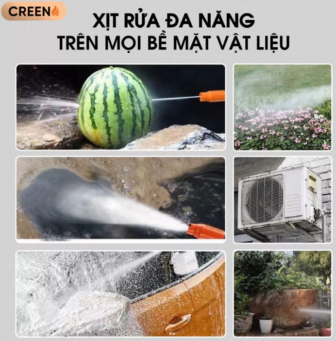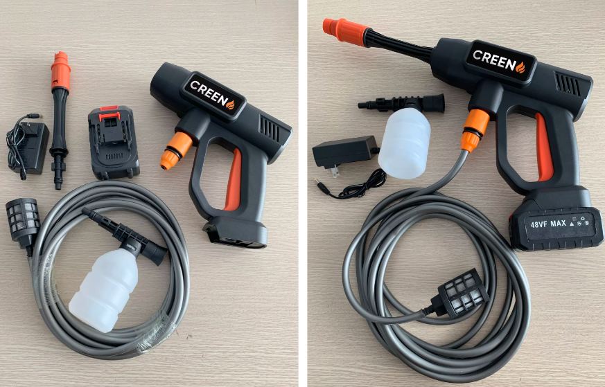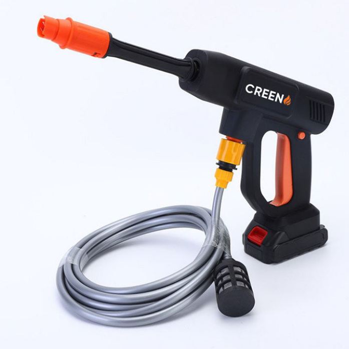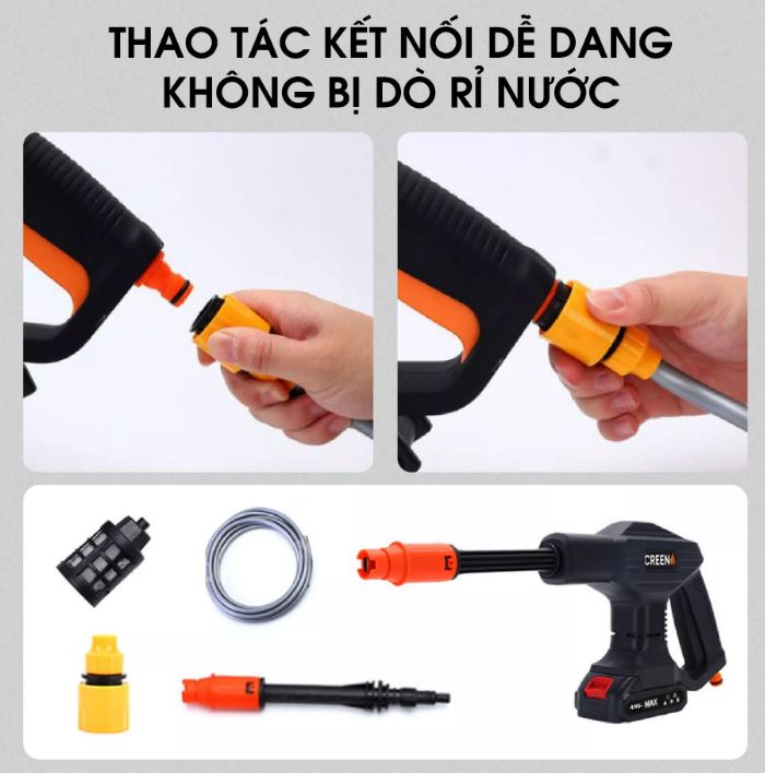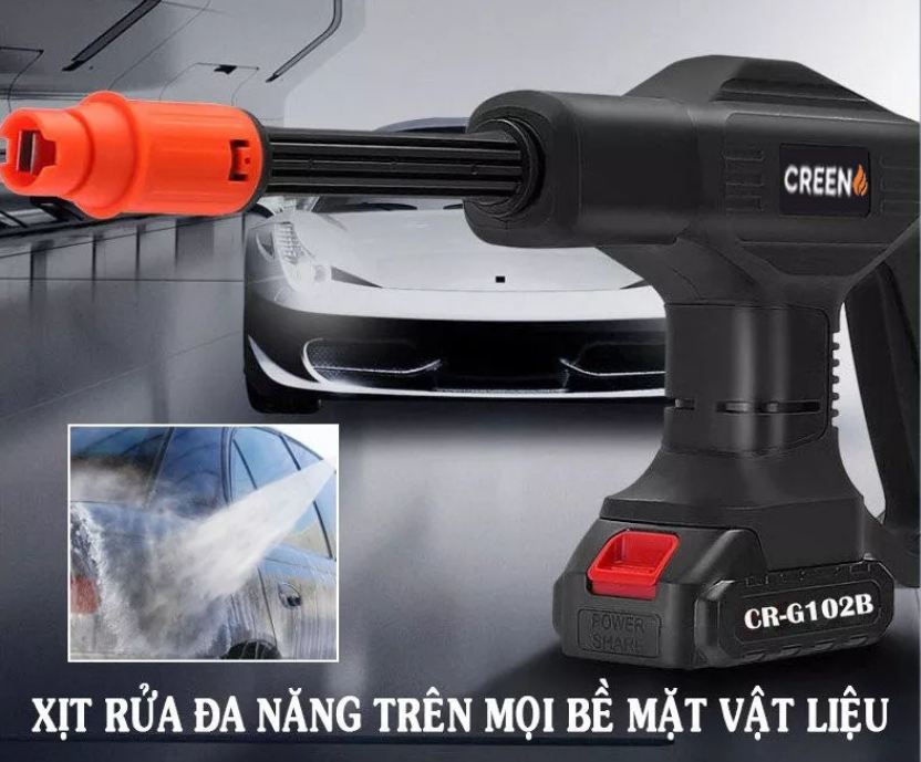 Súng rửa xe Creen G102, 48V với thiệt kế chắc chắn vừa tay cầm giúp dể dàng sử dụng.Vòi xịt có thể đều chỉnh nên có có thể dùng dùng cho máy bơm nước mini để rửa xe, máy lạnh, tưới cây……