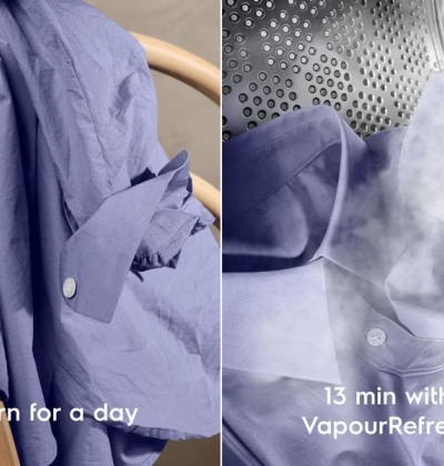 Nhanh chóng phục hồi quần áo và làm phẳng nếp nhăn trong chưa đầy 30 phút với chu trình VapourRefresh. Trang phục của bạn sẽ trở nên mới hơn, ít nếp nhăn hơn so với sấy khô bằng không khí.