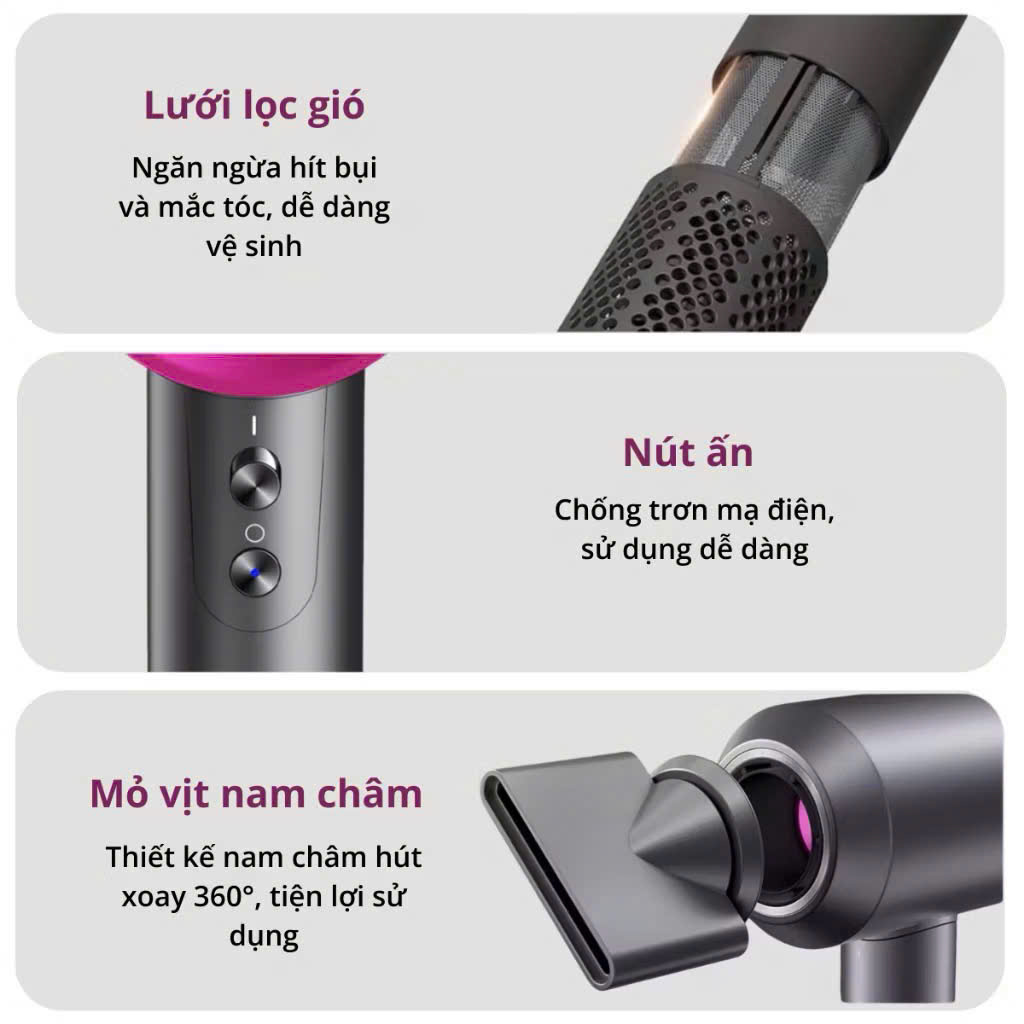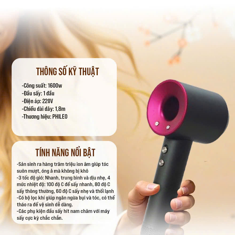 Thông tin chung về sản phẩm: Máy sấy tóc Phileo là một thiết bị chăm sóc tóc hiện đại, nổi bật với thiết kế "không cánh quạt" tương tự các dòng máy cao cấp, mang lại vẻ ngoài tinh tế và trải nghiệm sử dụng an toàn. Sản phẩm tích hợp công nghệ ion âm và đa dạng các chế độ gió, nhiệt, giúp người dùng sấy tóc nhanh chóng, hiệu quả mà vẫn giữ được mái tóc suôn mượt, óng ả và không bị khô. Đây là lựa chọn lý tưởng cho việc chăm sóc tóc hàng ngày tại nhà.