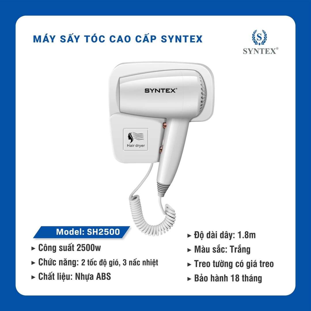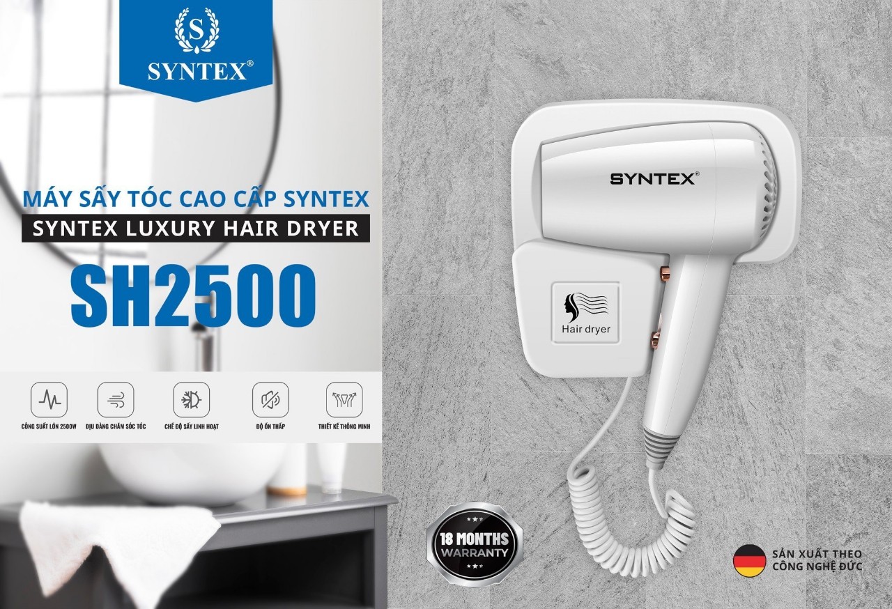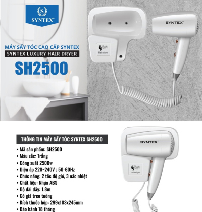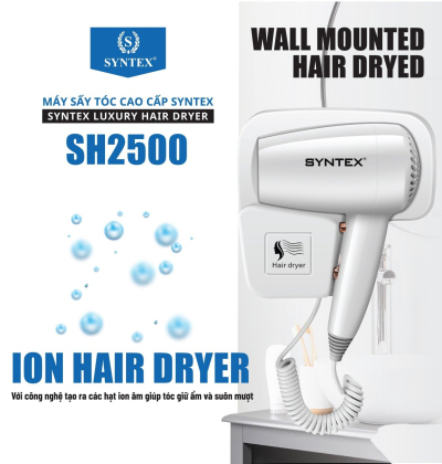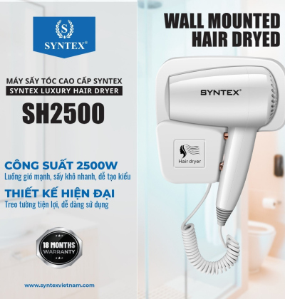 MÁY SẤY TÓC TREO TƯỜNG SYNTEX – SH2500 ra mắt thị trường năm 2023 trang trị công suất lớn 2500w, luồng gió thổi mạnh giúp cho việc sấy khô tóc nhanh hơn và dễ dàng tạo kiểu. Với thiết kế hiện đại, màu trắng trang nhã, treo tường tiện lợi phù hợp không gian trong nhà tắm của gia đình hoặc khách sạn