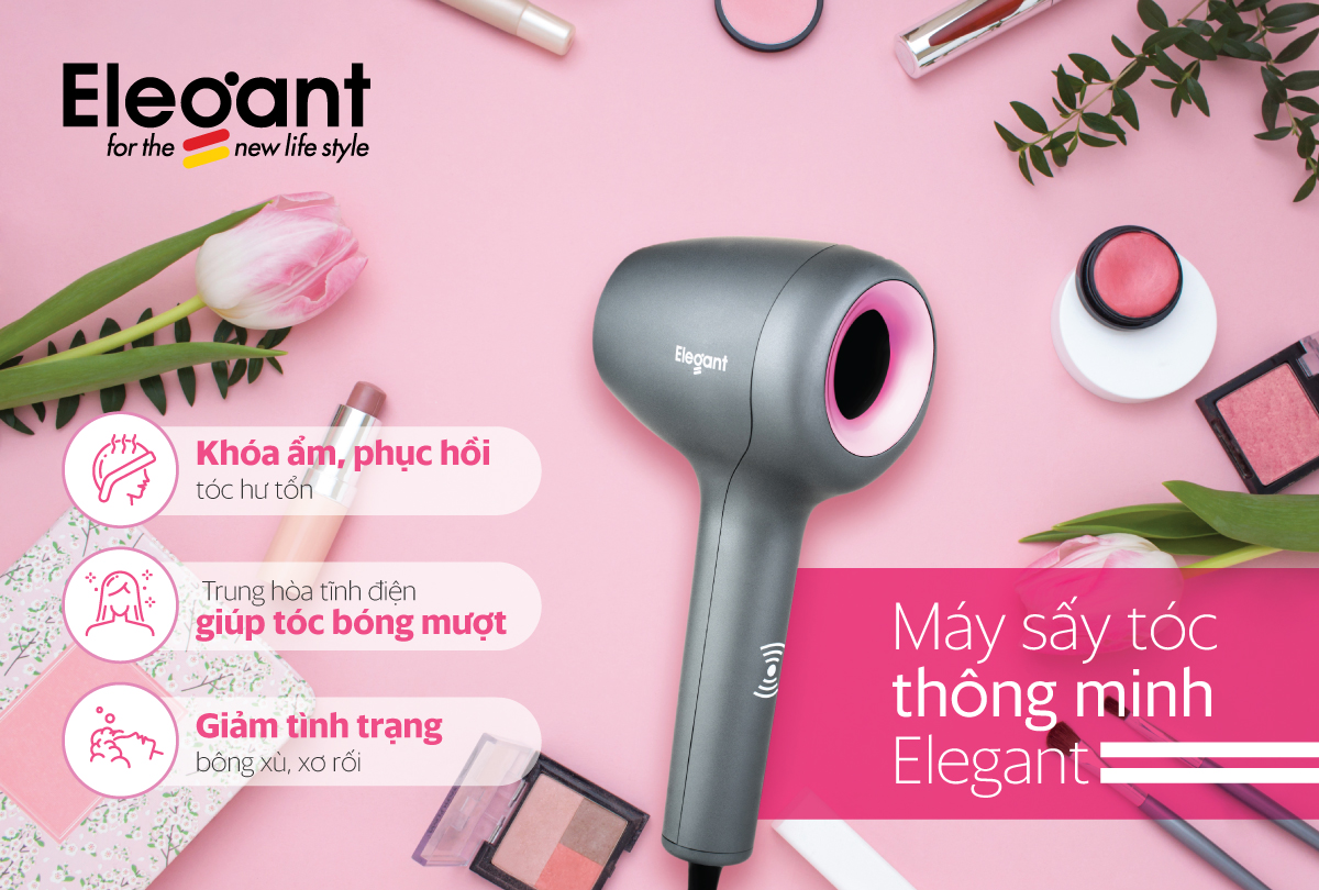 Khô nhanh hơn giảm thời gian sấy tóc. Ion giúp chăm sóc và bảo vệ mái tóc hoàn hảo: Máy sấy tóc Elegant có chức năng ion làm khô tóc bằng công nghệ mới các hạt ion âm làm phá vỡ các phân tử nước. Chính vì thế giúp cho mái tóc giảm thiểu chịu tác động từ nhiệt độ cao. Nhiệt độ cao chính là một trong những thủ phạm làm cho tóc dễ bị khô, sơ, gãy, rụng. Các ion âm khi đẩy theo luồng gió vào sẽ thắt chặt các lớp biểu bì, khiến cho tóc luôn giữ được độ ẩm tự nhiên cho chúng ta mái tóc khỏe, luôn mềm mại, óng mượt hơn. Ngoài ra dòng sấy tóc Elegant có Ion còn giúp cân bằng pH.
