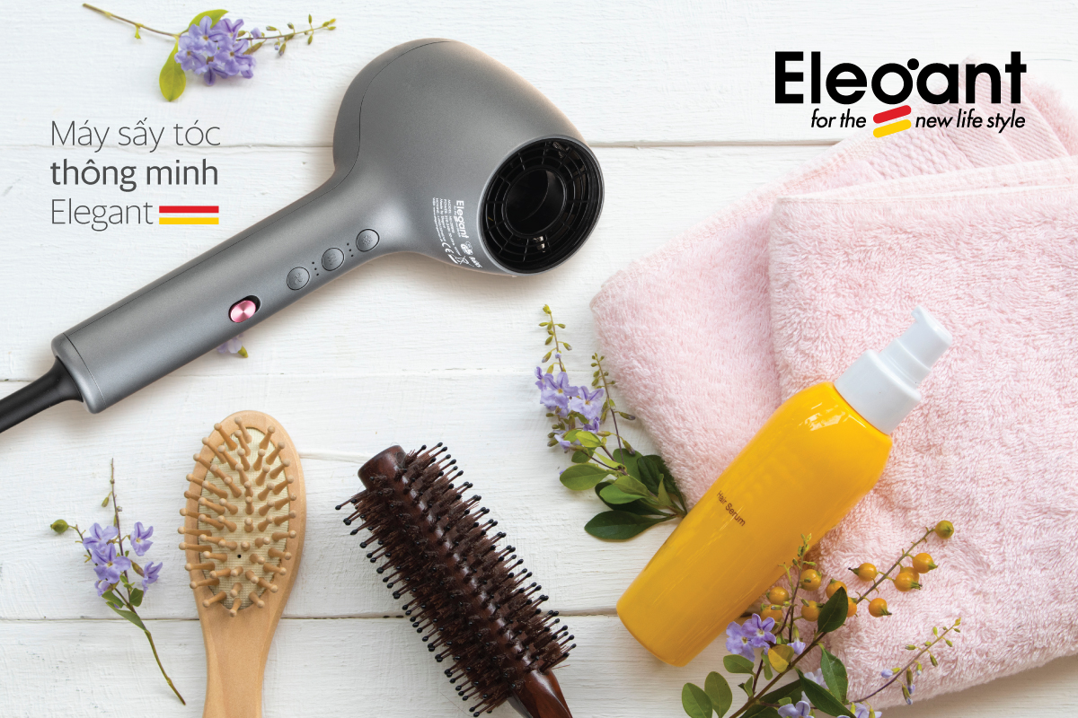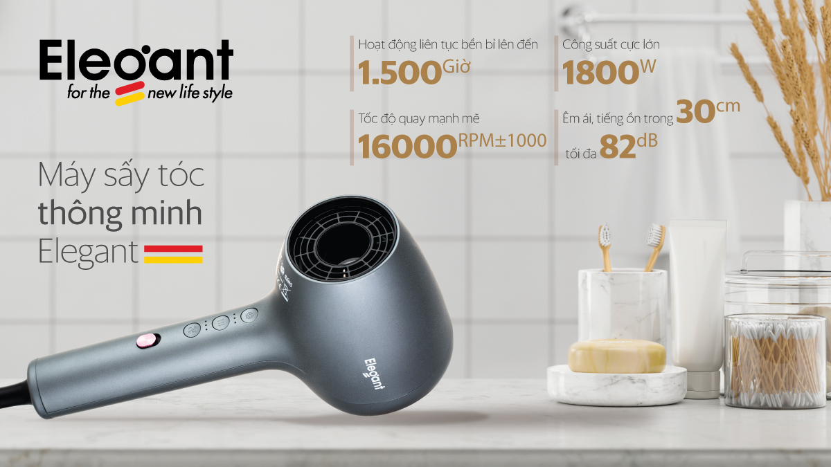Máy sấy tóc công nghệ Đức Elegant mới có công nghệ cao bức xạ thấp, tiết kiệm thời gian và gió mạnh làm khô nhanh để chăm sóc mẹ và bé.