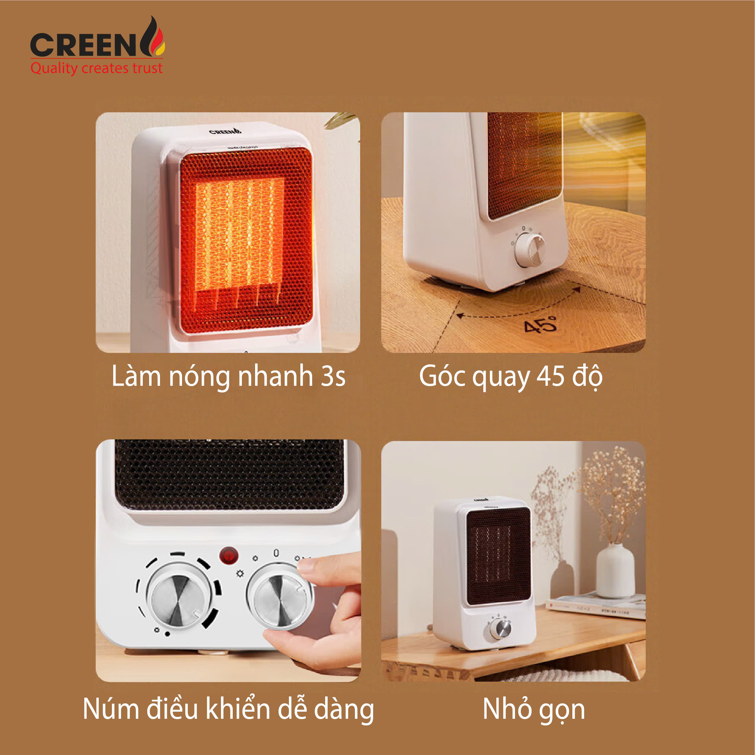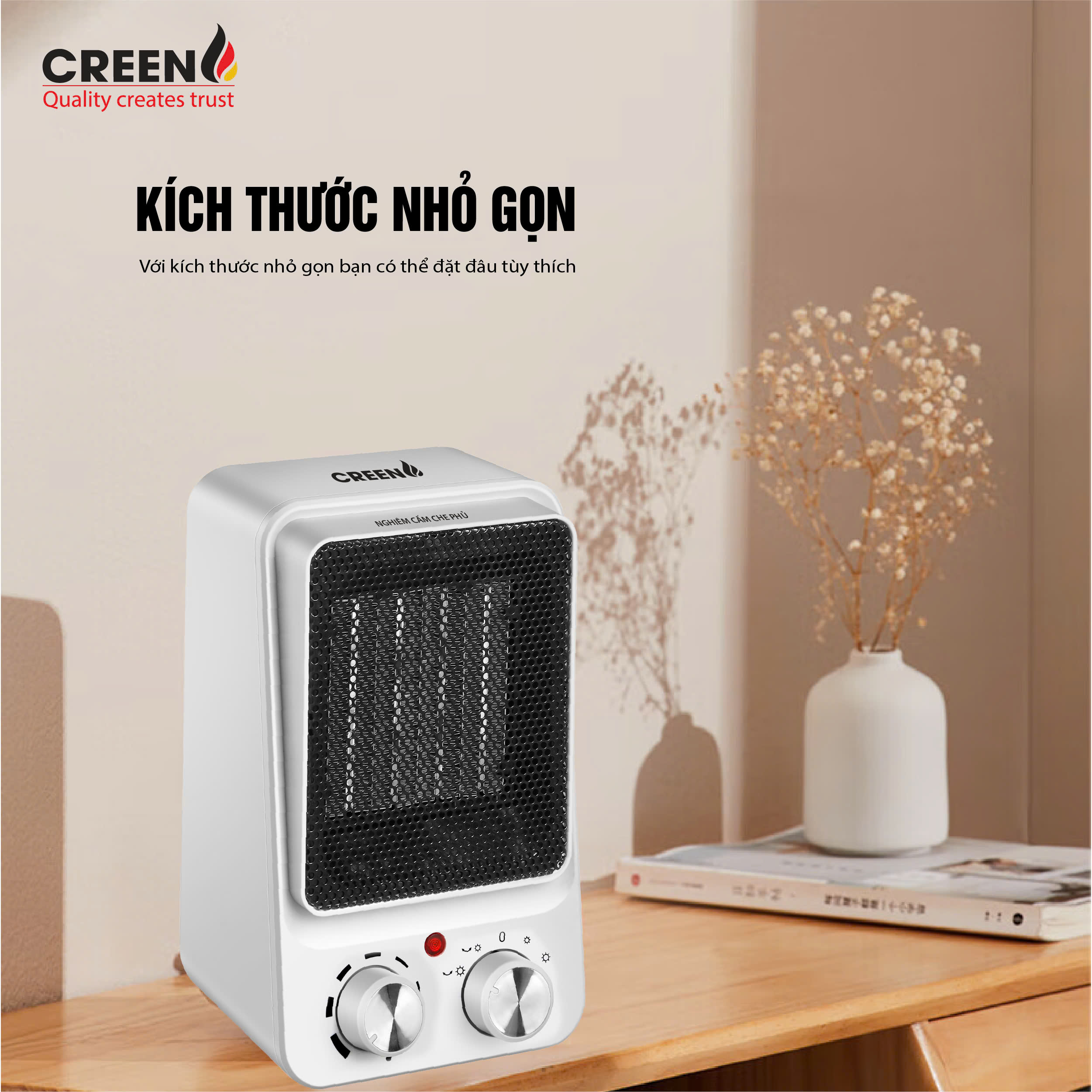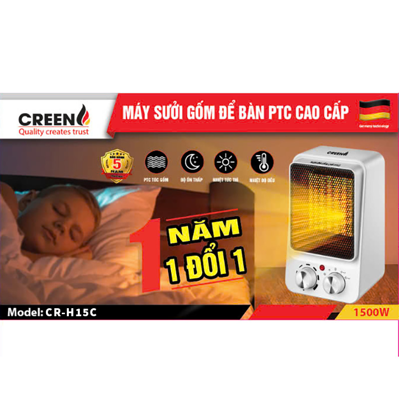 Máy sưởi gốm CREEN H15C là lựa chọn phù hợp cho nhu cầu sưởi ấm cá nhân trong mùa lạnh, giúp không gian nhanh chóng ấm lên mà vẫn đảm bảo an toàn và tiết kiệm điện năng.