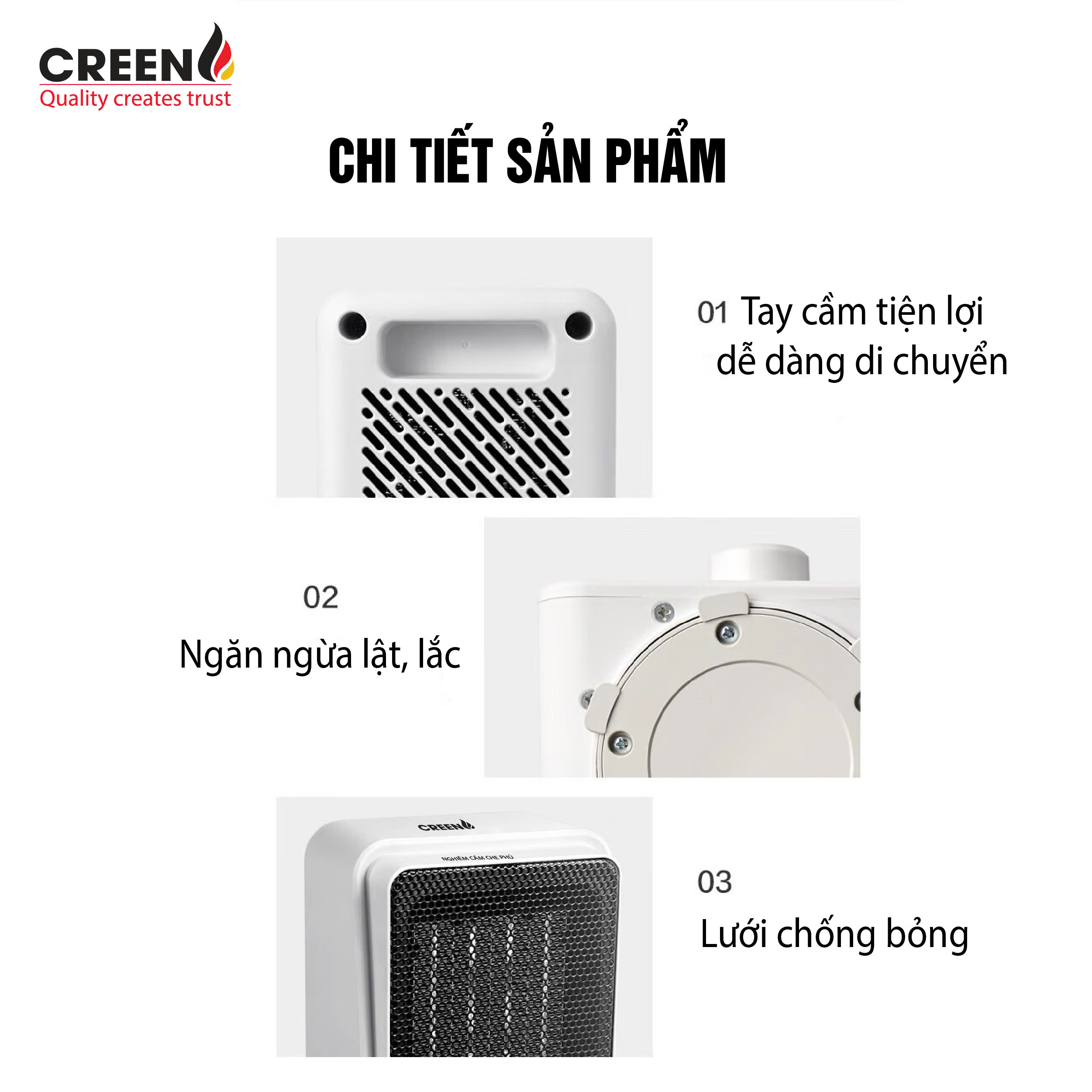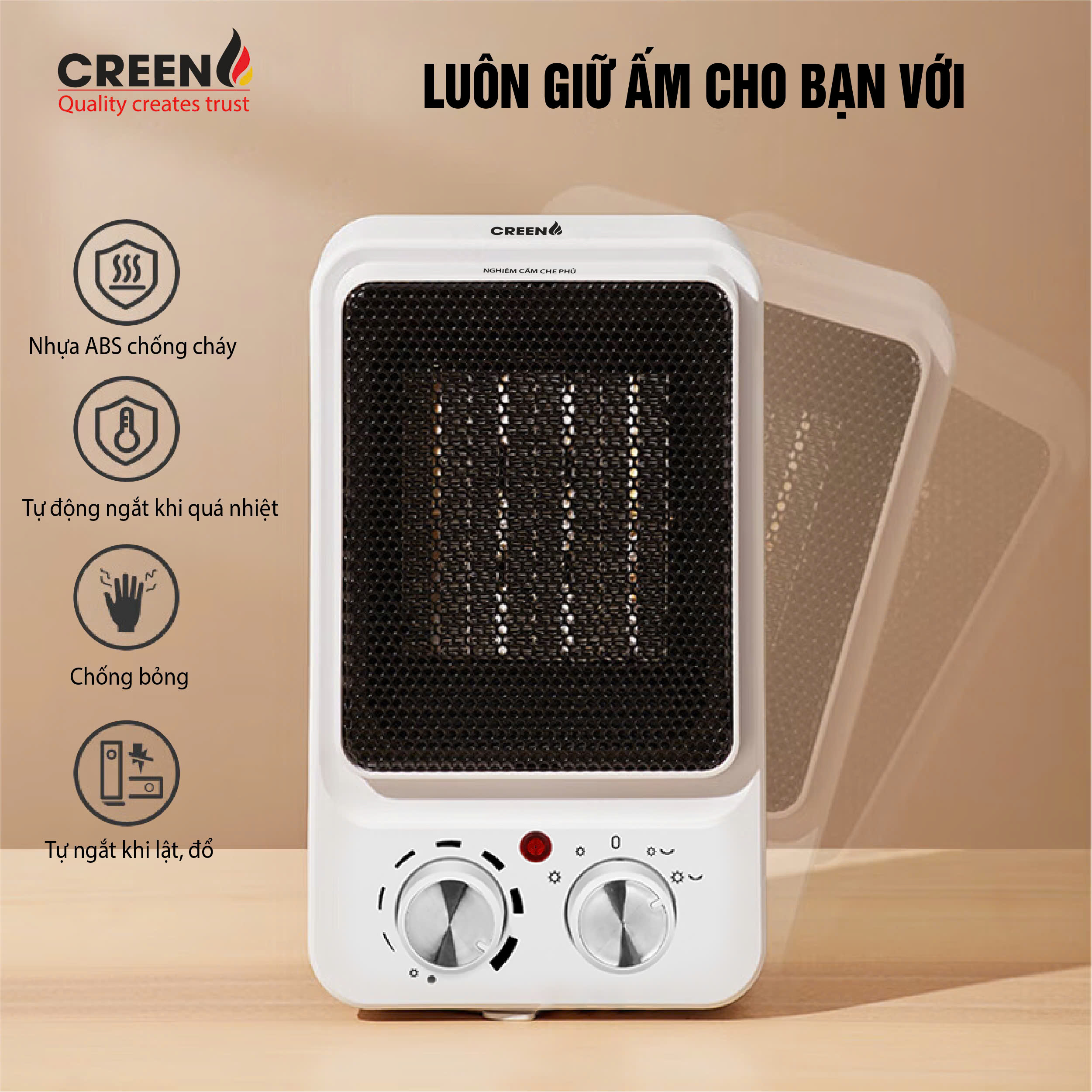 CREEn H15C được tích hợp tính năng tự ngắt khi quá nhiệt và khi máy bị nghiêng hoặc đổ ngã, giảm thiểu rủi ro cháy nổ, mang lại sự yên tâm cho người sử dụng.