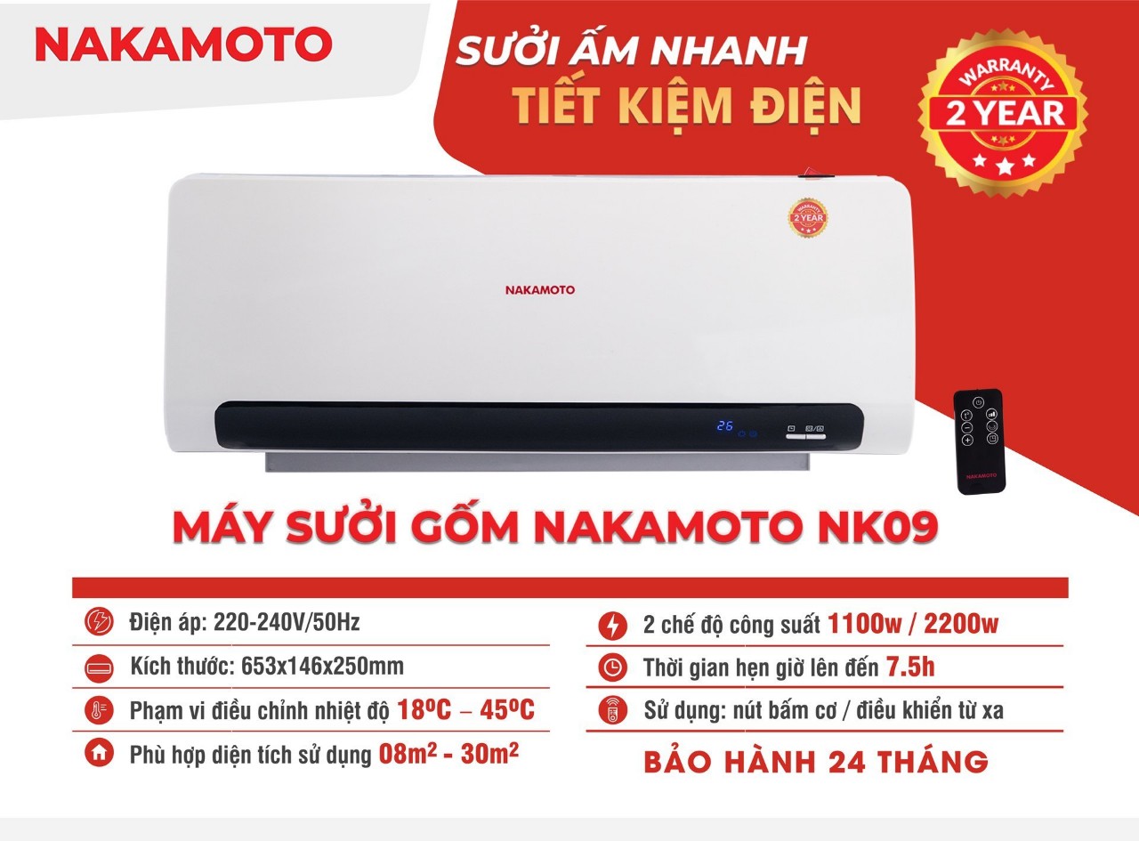 + Đặc biệt, sản phẩm máy sưởi gốm NAKAMOTO NK09 có chế độ bảo hành lên tới 2 năm (gấp đôi so với chế độ bảo hành của một số dòng máy sưởi gốm có trên thị trường).
