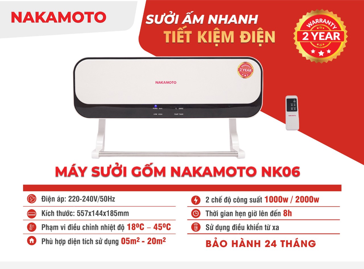 + Đặc biệt, sản phẩm máy sưởi gốm NAKAMOTO NK06 có chế độ bảo hành lên tới 2 năm (gấp đôi so với chế độ bảo hành của một số dòng máy sưởi gốm có trên thị trường).
