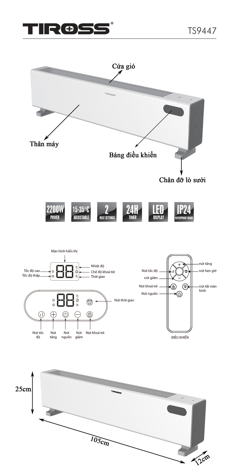 Máy sưởi sàn trong nhà Tiross TS9447 màn hình led, điều khiền từ xa