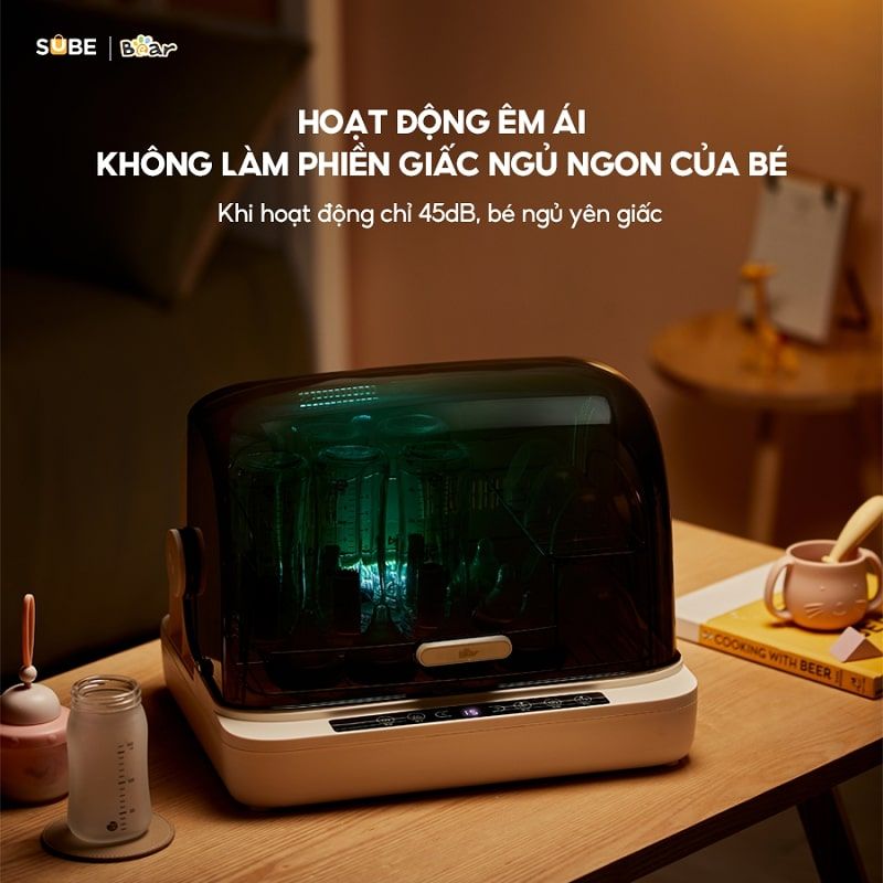 Máy tiệt trùng Bear vận hành êm ái và nhẹ nhàng, không phát ra tiếng ồn khó chịu. Cường độ âm thanh chỉ đạt mức 45dB khi hoạt động, đảm bảo bé yêu có giấc ngủ ngon và không bị thức giấc bởi tiếng máy.