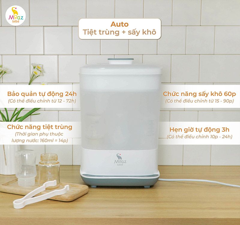 Sản phẩm được trang bị chức năng bảo quản tự động, giữ cho bình sữa ở môi trường sạch sẽ. Thời gian bảo quản lên đến 24 giờ. Cùng với đó là chức năng hẹn giờ để tự động tiệt trùng hoặc sấy khô theo nhu cầu.