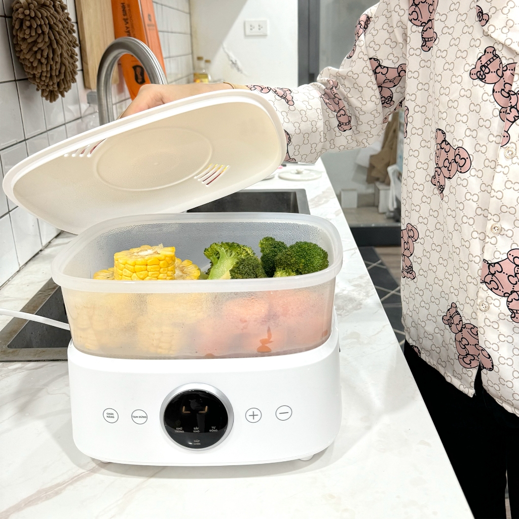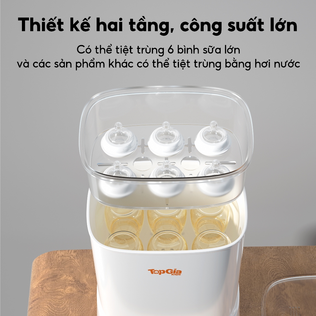 - Thiết kế 2 tầng, thể tích khoang lớn có thể khử trùng đồng thời 12 bình sữa lớn, đồ chơi