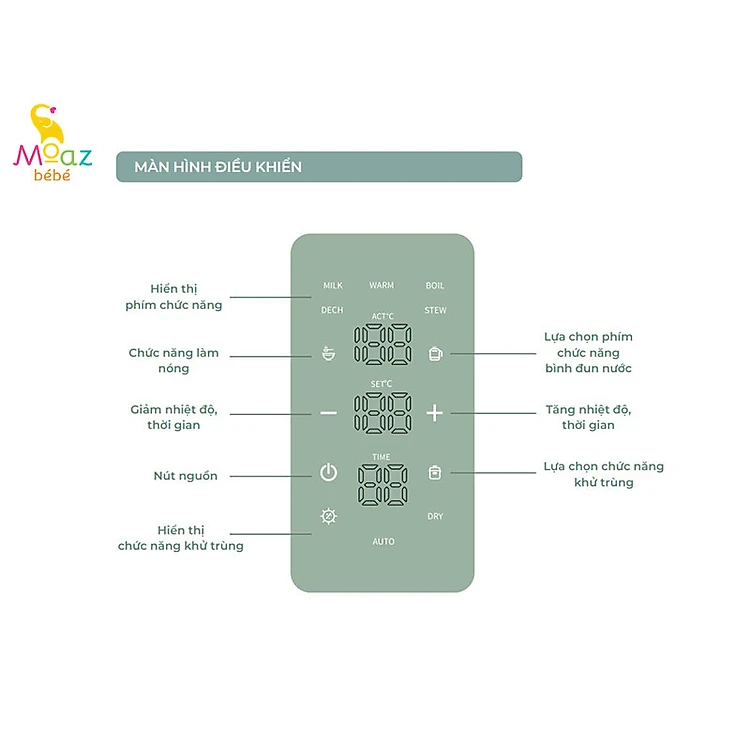 Bước 4: Nhấn nút để chọn chức năng mong muốn. Màn hình sẽ hiển thị ở chức năng được chọn và máy sẽ vào trạng thái làm việc sau 5 giây, sau khi chức năng hoàn thành, máy báo một tiếng bíp thông báo chu trình hoàn tất. Đợi bình sữa và núm ti nguội rồi mới lấy ra.