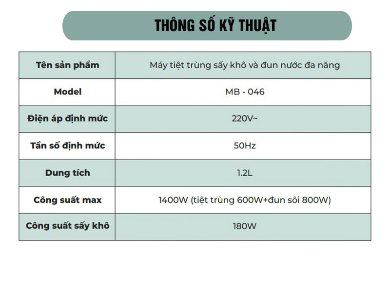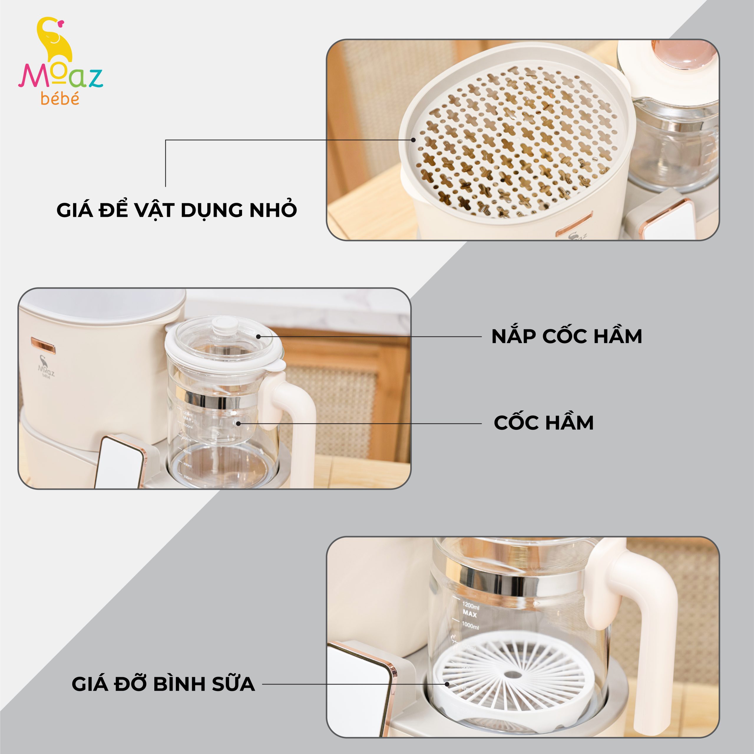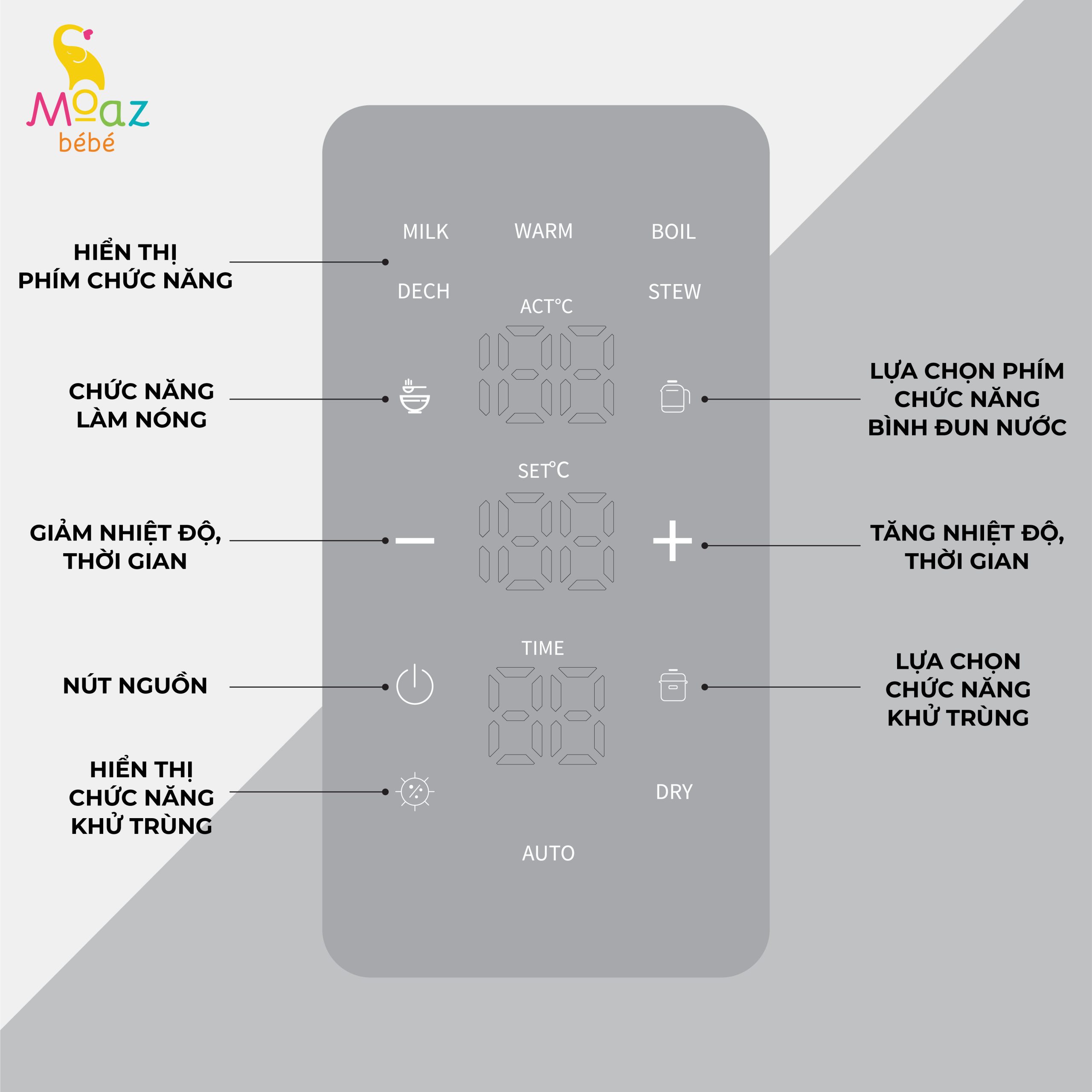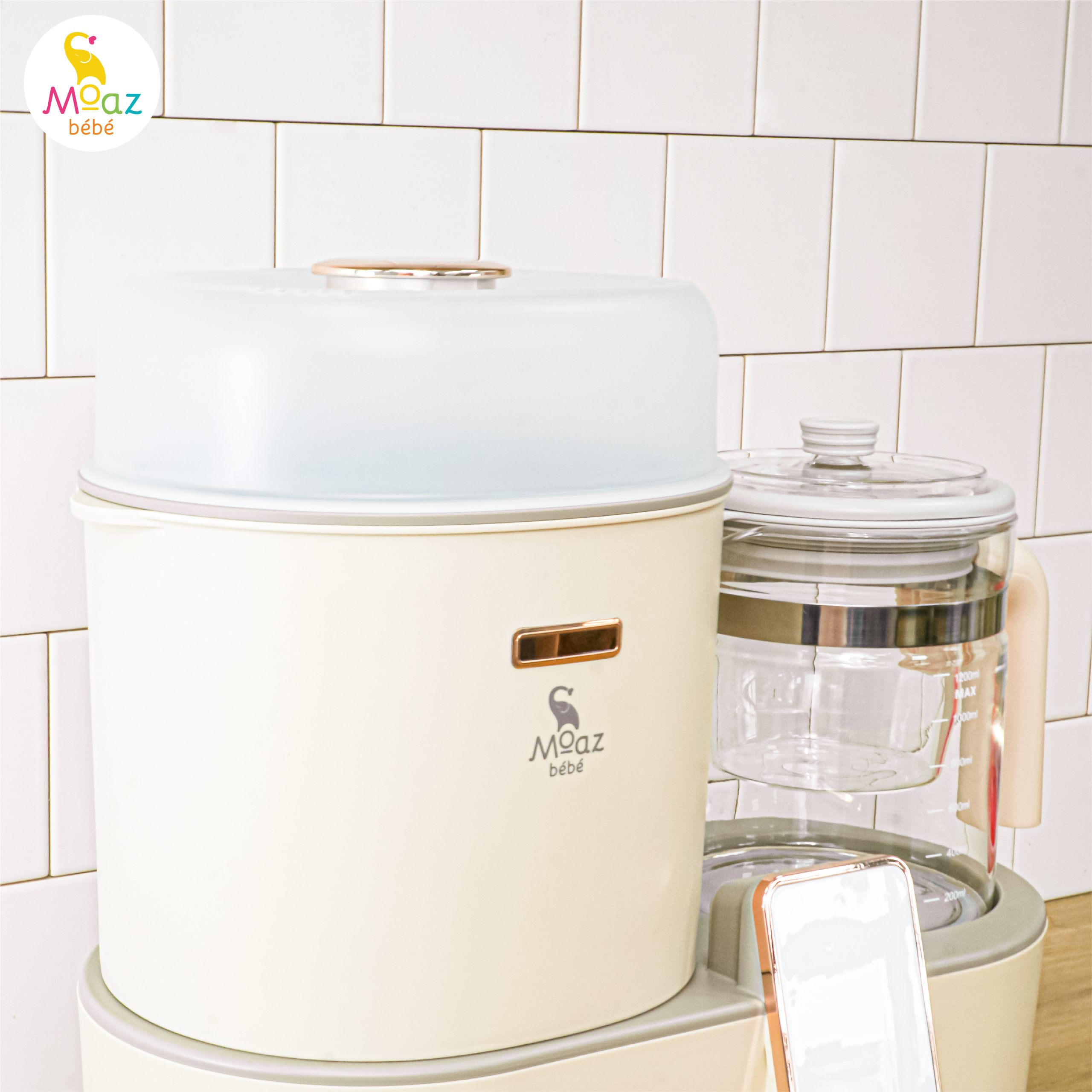 Máy tiệt trùng sấy khô và đun nước đa năng Moaz BéBé MB – 046 là sản phẩm đa tính năng: đun nước khử Clo pha sữa, tiệt trùng, sấy khô, hầm chè, chưng yến và hâm sữa cực kì thông minh. Các bộ phận được làm bằng chất liệu an toàn cho trẻ nhỏ. Dung tích khoang tiệt trùng lớn, tiệt trùng sấy khô cùng lúc 4 bình sữa. Hệ thống làm khô tuần hoàn không khí nóng, nhanh chóng sấy khô bình sữa.