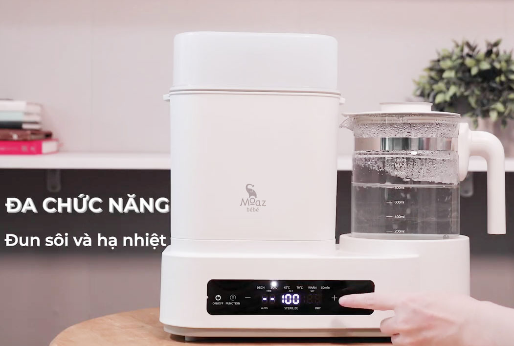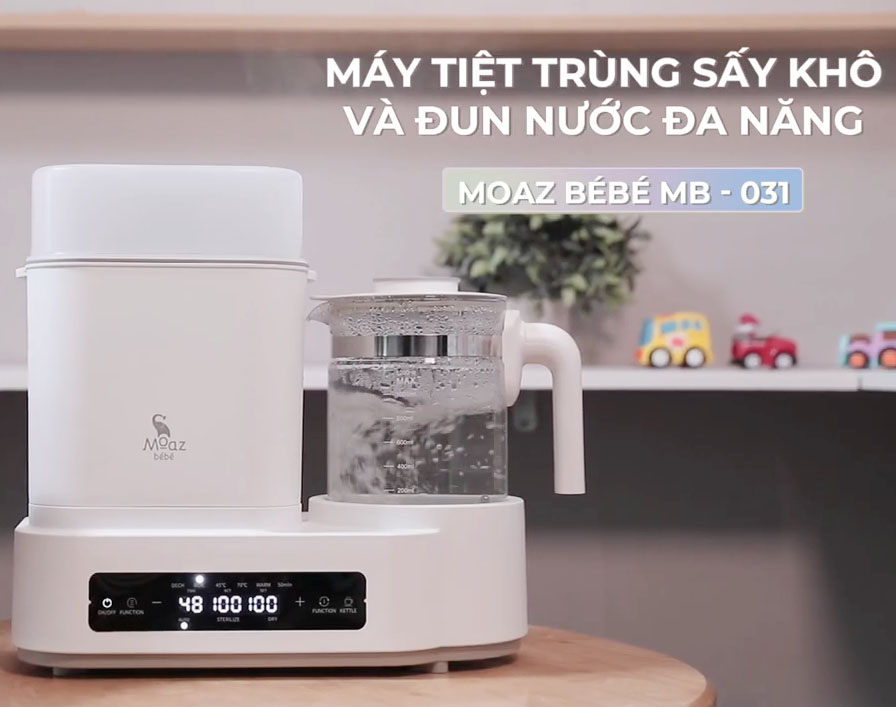 Máy tiệt trùng sấy khô và đun nước đa năng Moaz Bébé MB031 sở hữu lên tới 5 chức năng: Đun nước khử clo – giữ nhiệt 48h, tiệt trùng, sấy khô, hâm sữa, hầm chè – yến, đun trà.