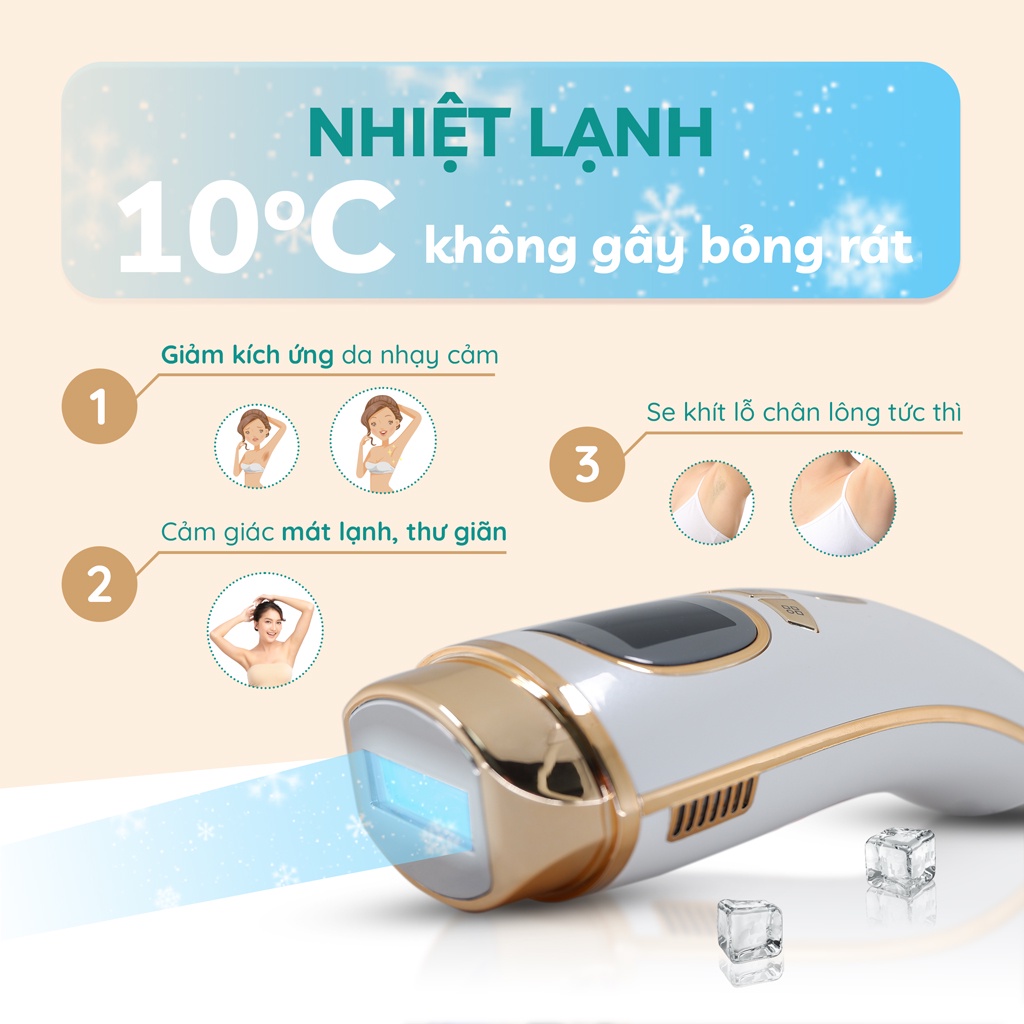 CÔNG NGHỆ TRIỆT NHIỆT ĐỘ LẠNH – đầu triệt được nâng cấp hệ thống làm lạnh với nhiệt độ 10 độ C không hề gây cảm giác đau hay bỏng rát như các công nghệ cũ, giúp da được giải nhiệt và se khít lỗ chân lông tức thì. Triệt lông lạnh âm độ ngoài ra còn đặc biệt phù hợp với các vùng triệt nhạy cảm như bikini, nách, mép. Khi triệt sẽ có cảm giác mát nhẹ cũng như kết quả triệt hiệu quả hơn rất nhiều so với các công nghệ triệt cũ.