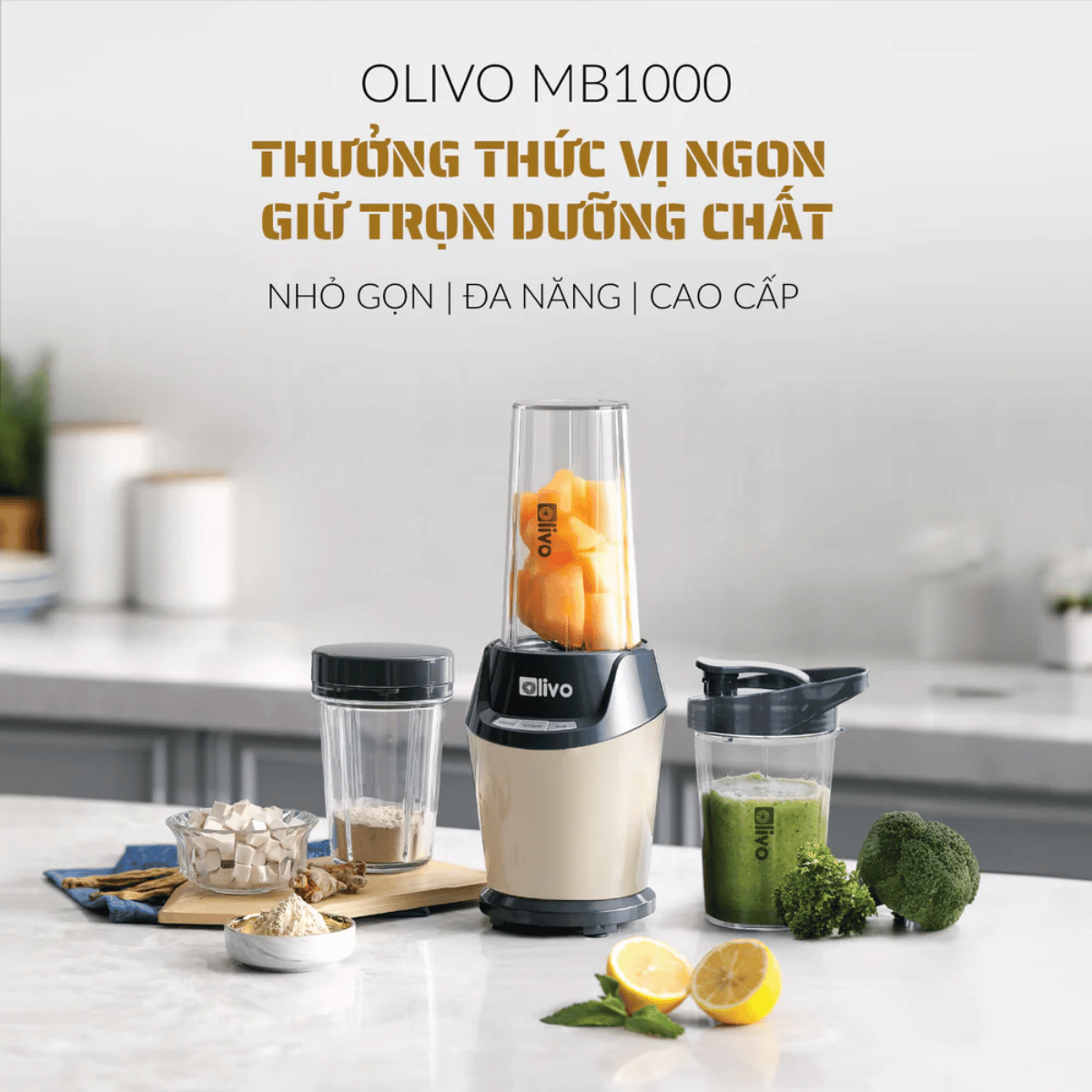 - OLIVO MB1000 được trang bị lưỡi dao sắc bén 6 cánh làm từ thép không gỉ cao cấp và bền bỉ. Thiết kế 3 tầng với 3 hình thái khác nhau giúp lưỡi dao tiếp xúc và cắt nguyên liệu tốt hơn, cho kết quả xay nhuyễn và mịn hơn.