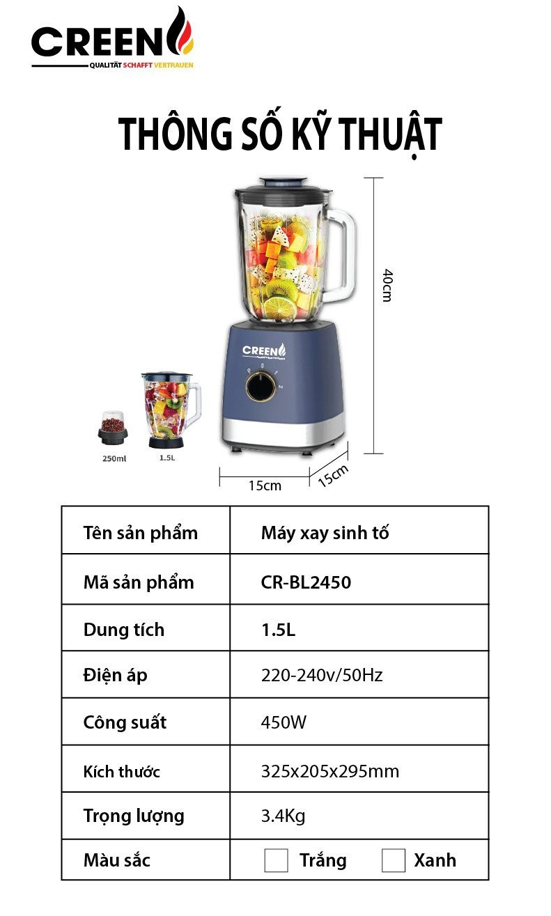 Máy xay sinh tố 3 cối CREEN CR-BL3450, bảo hành chính hãng