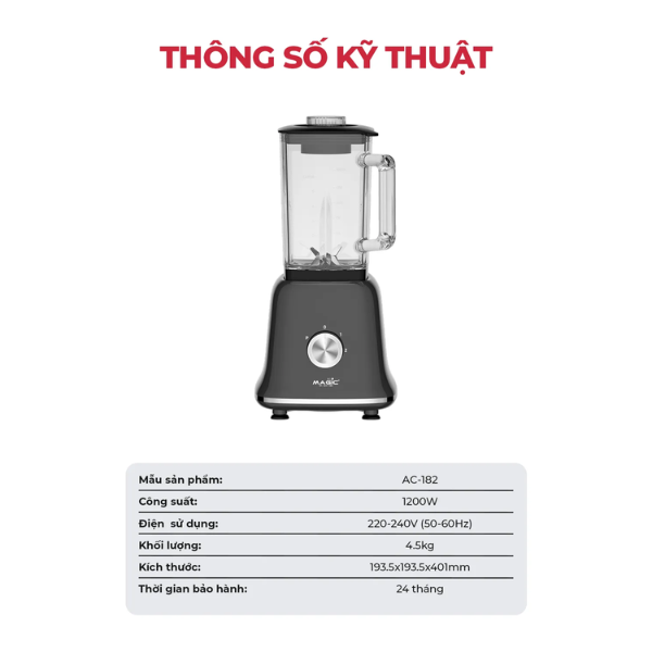 Máy xay sinh tố Magic AC-182 là thiết bị đa năng lý tưởng cho gia đình yêu thích đồ uống và thực phẩm dinh dưỡng. Với công suất 1200W mạnh mẽ, máy giúp xay nhuyễn đá, trái cây, hạt cứng và các loại thực phẩm mềm một cách nhanh chóng, tiết kiệm thời gian.