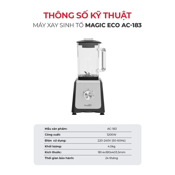 Magic Eco AC-183 có thiết kế nhỏ gọn tinh tế, phù hợp với mọi không gian bếp hiện đại. Máy hoạt động êm, giảm rung và tiếng ồn, mang lại trải nghiệm sử dụng dễ chịu. Các tính năng an toàn như tự ngắt khi quá nhiệt và khóa nắp cối giúp người dùng yên tâm, đặc biệt trong gia đình có trẻ nhỏ hoặc người cao tuổi.