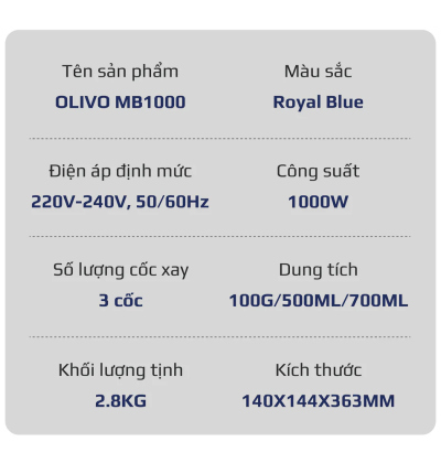 Với OLIVO MB1000, bạn có thể thoải mái sáng tạo các món sinh tố, nước ép, sữa hạt hay các loại sốt, súp và món ăn bổ dưỡng cho gia đình. Đây là sự kết hợp hoàn hảo giữa công suất mạnh mẽ, tính năng đa dạng và độ bền vượt trội, xứng đáng là lựa chọn hàng đầu cho mọi căn bếp hiện đại.