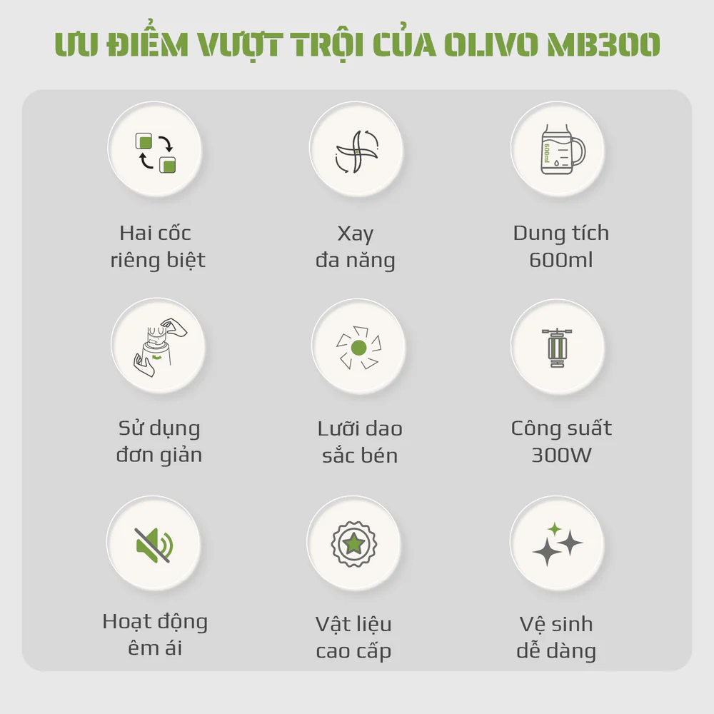 Máy xay sinh tố OLIVO MB300 là lựa chọn hoàn hảo dành cho gia đình hiện đại với thiết kế sang trọng, động cơ mạnh mẽ và khả năng xay đa năng. Sản phẩm giúp bạn chế biến nhanh chóng các loại sinh tố, nước ép, đồ uống dinh dưỡng cũng như các món ăn từ rau củ, thịt, hạt.![]()