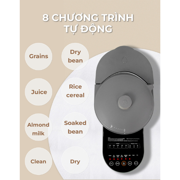 Cối xay thủy tinh Borosilicate dung tích 1.6L an toàn sức khỏe, chịu nhiệt cao, không bám mùi và dễ quan sát quá trình xay. Máy đi kèm 8 chương trình nấu sẵn bao gồm sữa hạt, cháo, soup, sinh tố, hạt khô, hạt mềm, sinh tố lạnh và detox, giúp người dùng dễ dàng chế biến thực phẩm chỉ với một nút bấm.