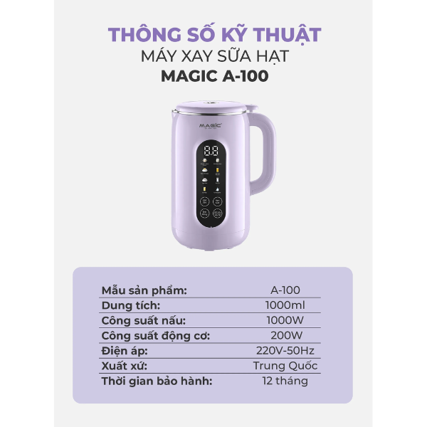 Máy xay sữa hạt Magic A-100 là dòng máy đa năng cao cấp dành cho gia đình hiện đại, được tích hợp công suất cao 1000W cùng loạt chức năng tự động thông minh. Thiết kế mạnh mẽ, bền bỉ và khả năng xay nấu nhanh giúp việc chuẩn bị các món dinh dưỡng trở nên thuận tiện và tiết kiệm thời gian hơn. Bạn có thể dễ dàng chế biến sữa hạt, soup, cháo, sinh tố, thức uống nóng lạnh với thao tác đơn giản.