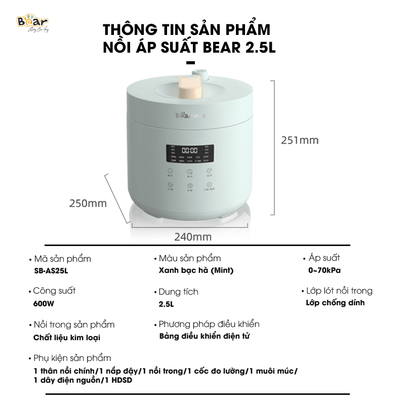 Nồi áp suất Bear 2.5L SB-AS25L với áp suất và nhiệt độ cao sẽ giúp bạn nấu những món ăn ngon và bổ dưỡng một cách nhanh chóng. Bạn có thể dễ dàng điều chỉnh áp suất từ 0 đến 70kPA để phù hợp với các loại thực phẩm khác nhau. Dưới đây là một số thông số kỹ thuật, chức năng chính và lợi ích của sản phẩm nồi điện đa năng này.