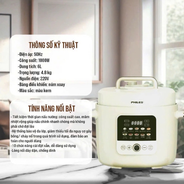 Tên sản phẩm: NỒI ÁP SUẤT ĐIỆN ĐA NĂNG PHILEO - PH 6000
