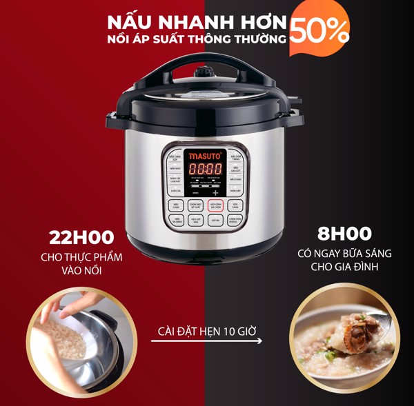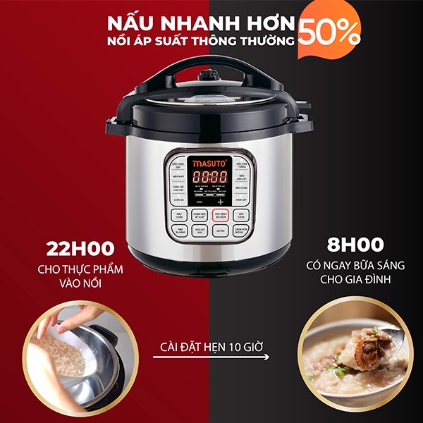 Nồi áp suất Masuto có dung tích 6L, phù hợp với các hộ gia đình từ 3 đến 6 người, ruột nồi phù hợp với hầu hết những nồi áp suất cùng thể tích. Thay thế 7 loại thiết bị nhà bếp, tiết kiệm thời gian, không gian cho căn bếp gia đình.