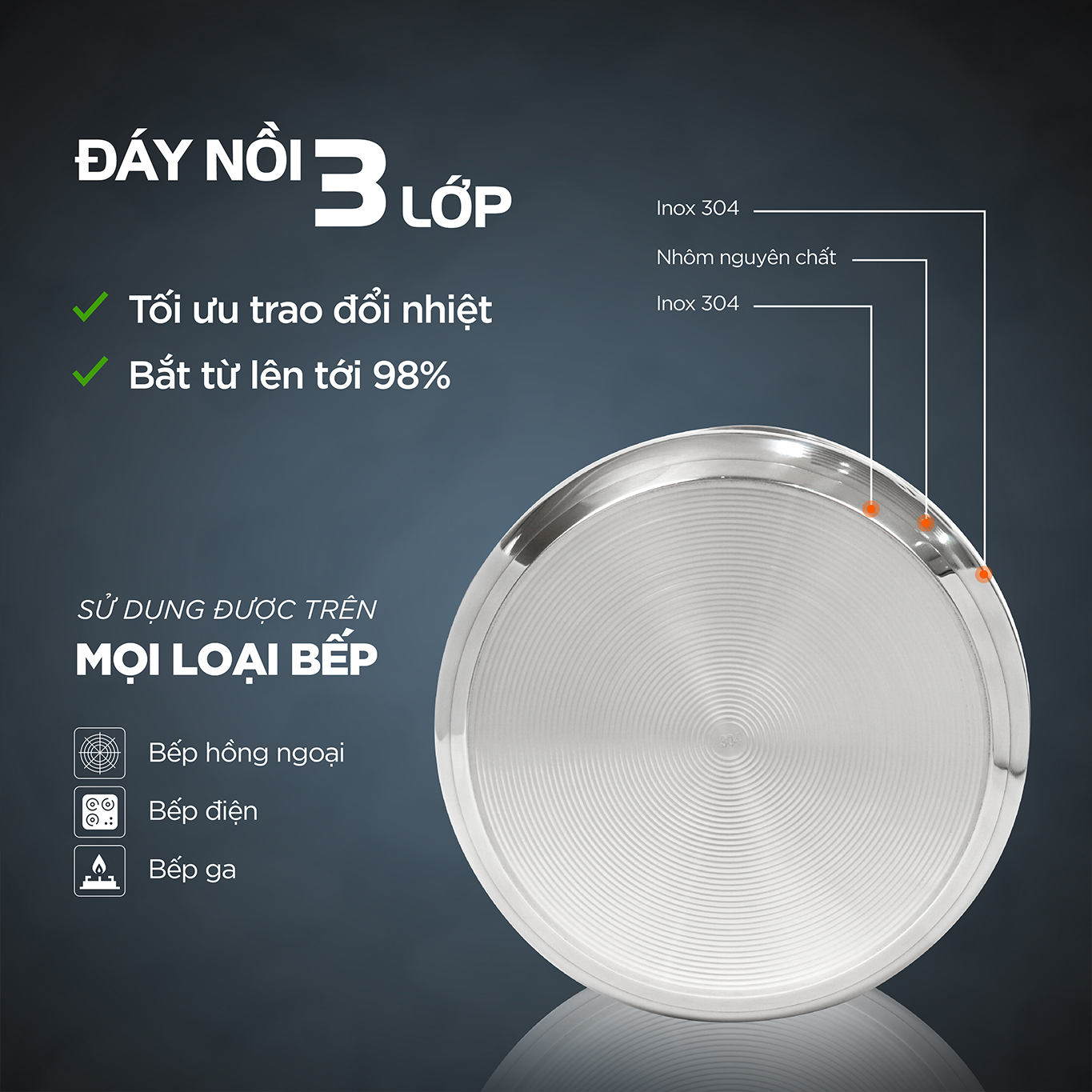 Ruột nồi Inox 304 không ghỉ, không bị oxi hóa, an toàn