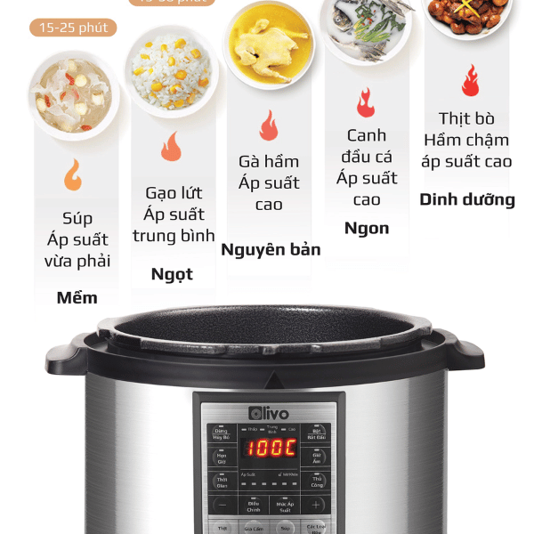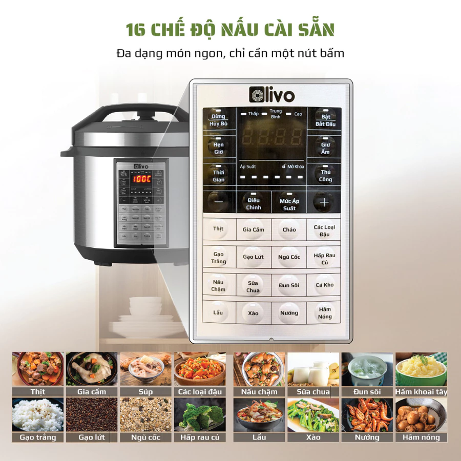 – Những chế độ nấu ăn cơ bản của nồi áp suất OLIVO PC60 đó là: Thịt, Gia Cầm, Súp, Các Loại Đậu, Gạo Trắng, Gạo Lứt, Ngũ Cốc, Hầm Rau Củ, Nấu Chậm, Sữa Chua, Đun Sôi, Hầm Khoai Tây, Lẩu, Xào, Xướng, Hâm Nóng.