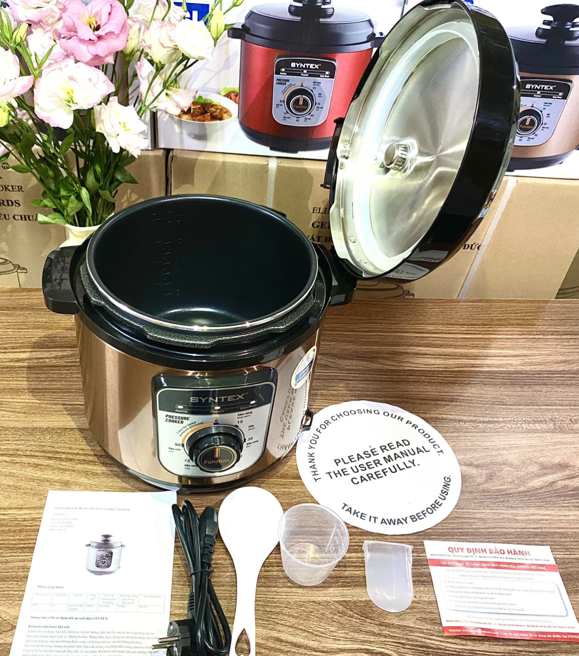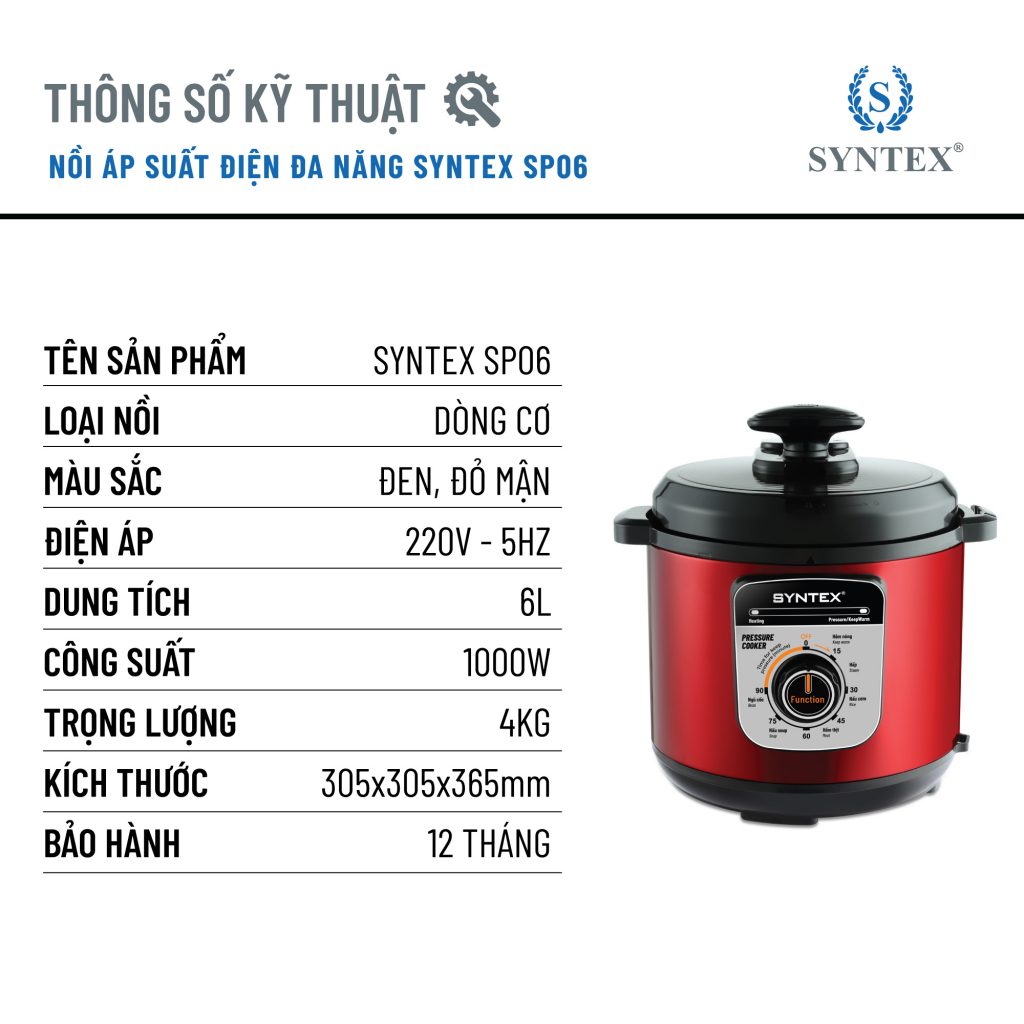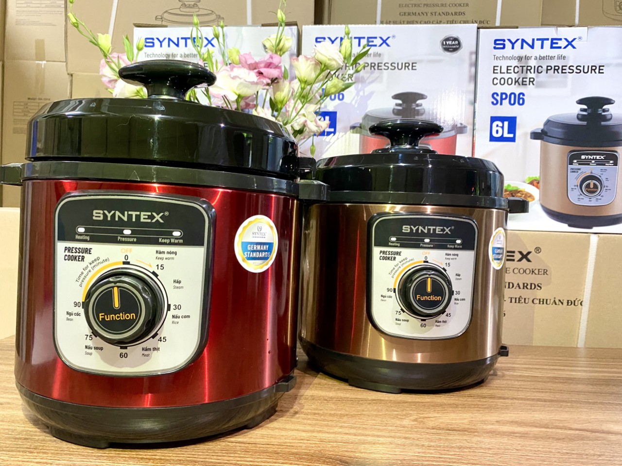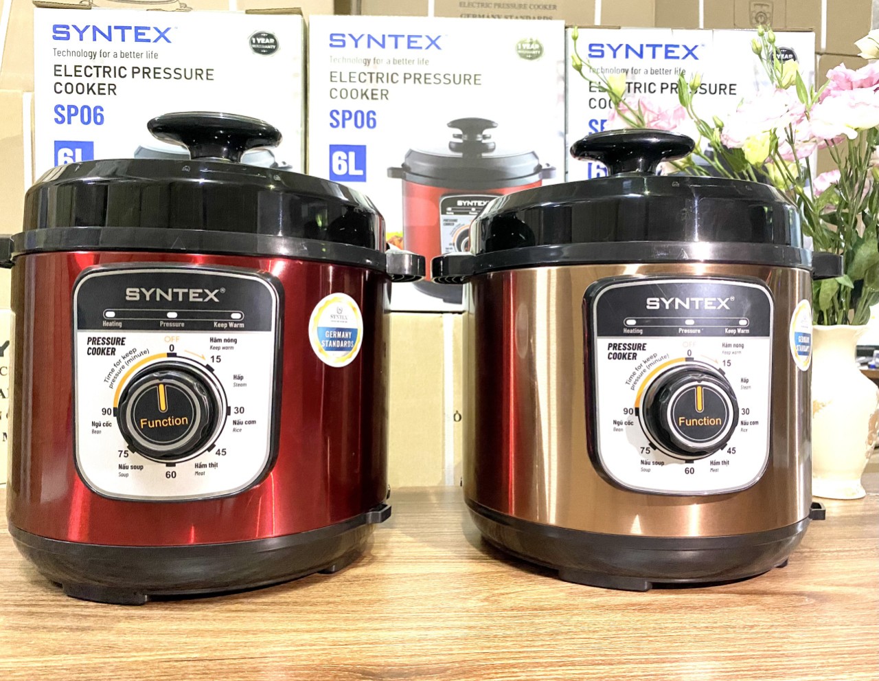 Nồi áp suất điện Syntex SP06 có dung tích 6 lít sẽ nấu đủ phần ăn cho gia đình có 6 - 8 người. Nồi sở hữu 2 màu sắc đẹp mắt, kiểu dáng sang trọng, phù hợp với mọi sở thích của các gia đình.