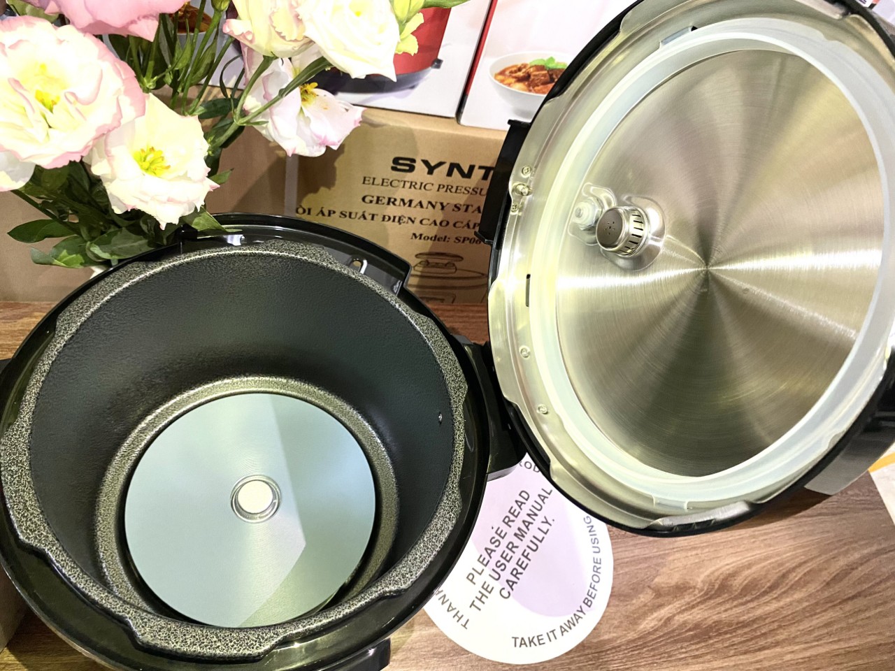 Syntex SP06 thiết kế nắp đậy có khóa an toàn, giúp người dùng yên tâm sử dụng. Người sử dụng không thể chọn chức năng nấu nếu không nắp không được lắp đặt đúng vị trí.