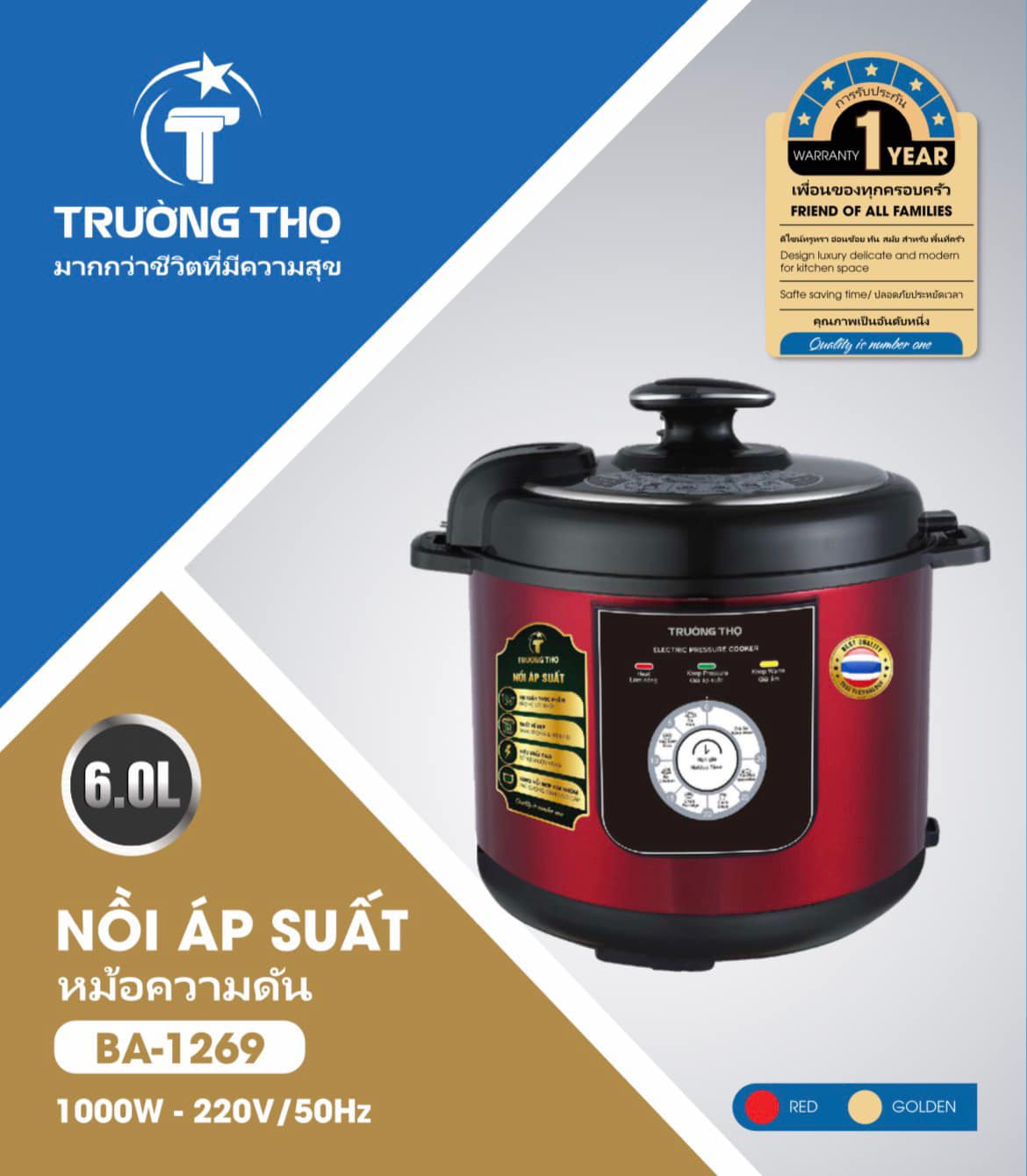Nồi áp suất điện Trường Thọ BA - 1269 có thiết kế nổi bật với thân nồi bằng inox cao cấp 430 đánh bóng xước sơn tĩnh điện màu đỏ/đồng sang trọng, tạo điểm nhấn cho căn bếp gia đình. Chất liệu siêu bền, cao cấp giúp sản phẩm hạn chế bị vỡ, trầy xước khi rơi hay va chạm, vừa giúp việc vệ sinh dễ dàng hơn. Chỉ cần lấy khăn ẩm lau nhẹ là các vết bẩn nhanh chóng biến mất.
