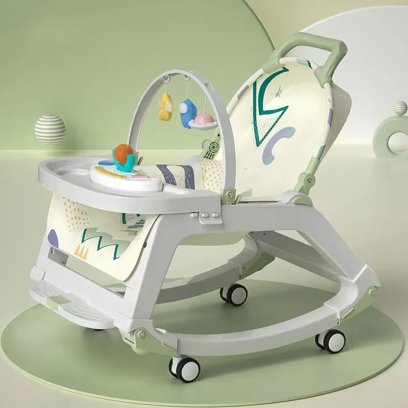 - Ghế dễ dàng chuyển đổi sang 5 chế độ: Ghế bập bênh / Ghế ngồi / Xe đẩy trẻ em / Xe đẩy / Bàn ăn (kèm Hộp nhạc / Đồ chơi nhỏ)