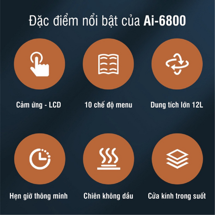 - Thiết kế trang nhã,sang trọng - Chất liệu an toàn,bền bỉ - Dung tích lớn 12 Lít - Màn hình cảm ứng thông minh 10 chế độ chiên nướng - Tự động tắt nguồn khi mở cửa - Hẹn giờ thông minh
